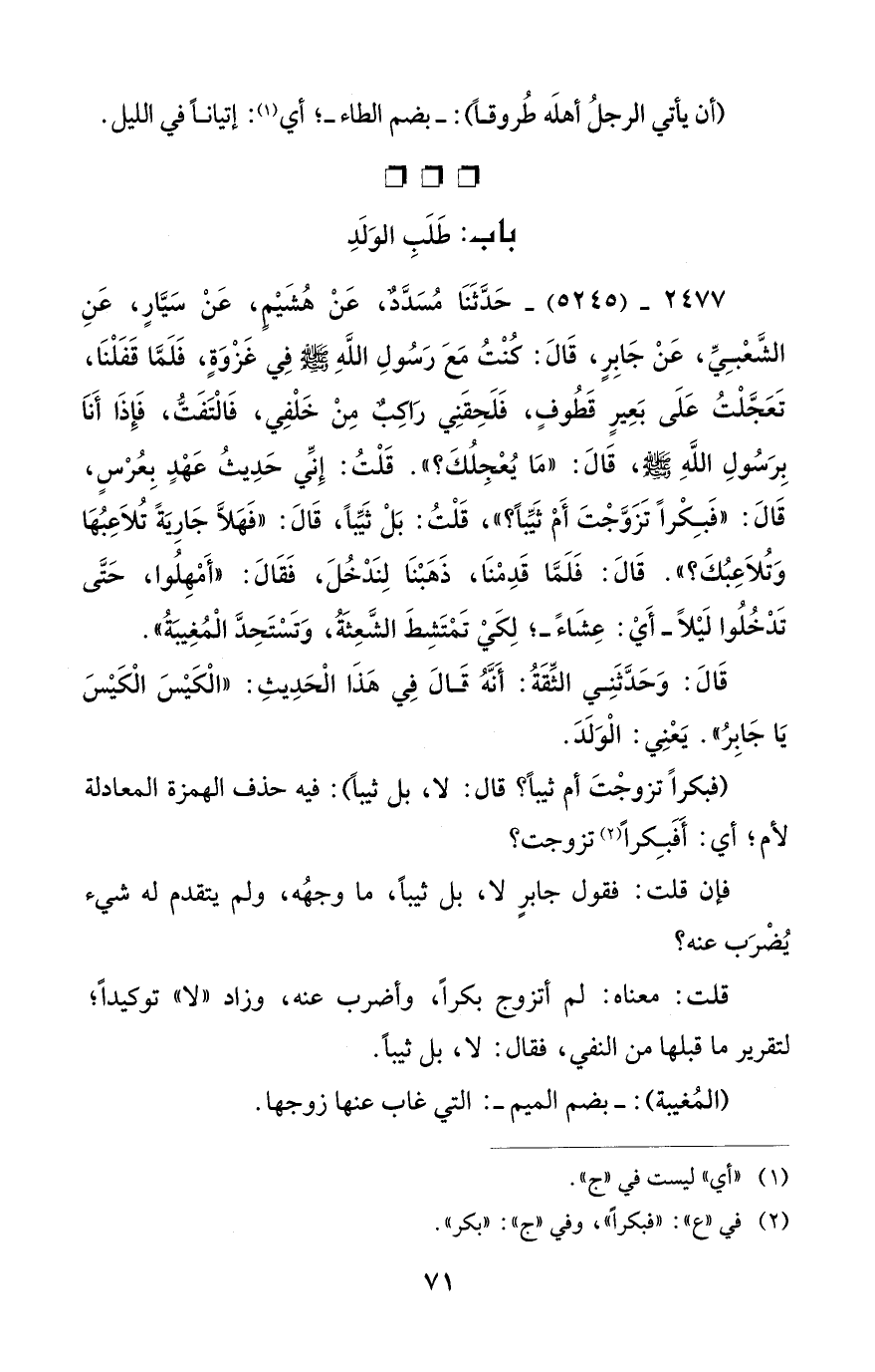 2477 - (5245) - حَدَّثَنَا مُسَدَّد، عَنْ هُشَيْمٍ، عَنْ سَيَّارٍ، عَنِ الشَعْبِيِّ، عَنْ جَابِرٍ، قَالَ: كُنْتُ مَعَ رَسُولِ اللَّهِ - صلى الله عليه وسلم - في غَزْوَةٍ، فَلَمَّا قَفَلْنَا، تَعَجَّلْتُ عَلَى بَعِيرٍ قَطُوفٍ، فَلَحِقَنِي رَاكبٌ مِنْ خَلْفِي، فَالْتَفَتُّ، فَإِذَا أَنَا بِرَسُولِ اللَّهِ - صلى الله عليه وسلم -، قَالَ: "مَا يُعْجِلُكَ؟ ". قَلْتُ: إِنِّي حَدِيثُ عَهْدٍ بِعُرْسٍ، قَالَ: "فَبِكْرًا تَزَوَّجْتَ أَمْ ثَيِّبًا؟ "، قَك: بَلْ ثَيِّبًا، قَالَ: "فَهَلَّا جَارِيَةً تُلَاعِبُهَا وَتُلَاعِبُكَ؟ ". قَالَ: فَلَمَّا قَدِمْنَا، ذَهَبْنَا لِنَدْخُلَ، فَقَالَ: "أَمْهِلُوا، حَتَّى تَدْخُلُوا لَيْلًا -أَيْ: عِشَاءً-؛ لِكَيْ تَمْتَشِطَ الشَّعِثَةُ، وَتَسْتَحِدَّ الْمُغِيبَةُ".