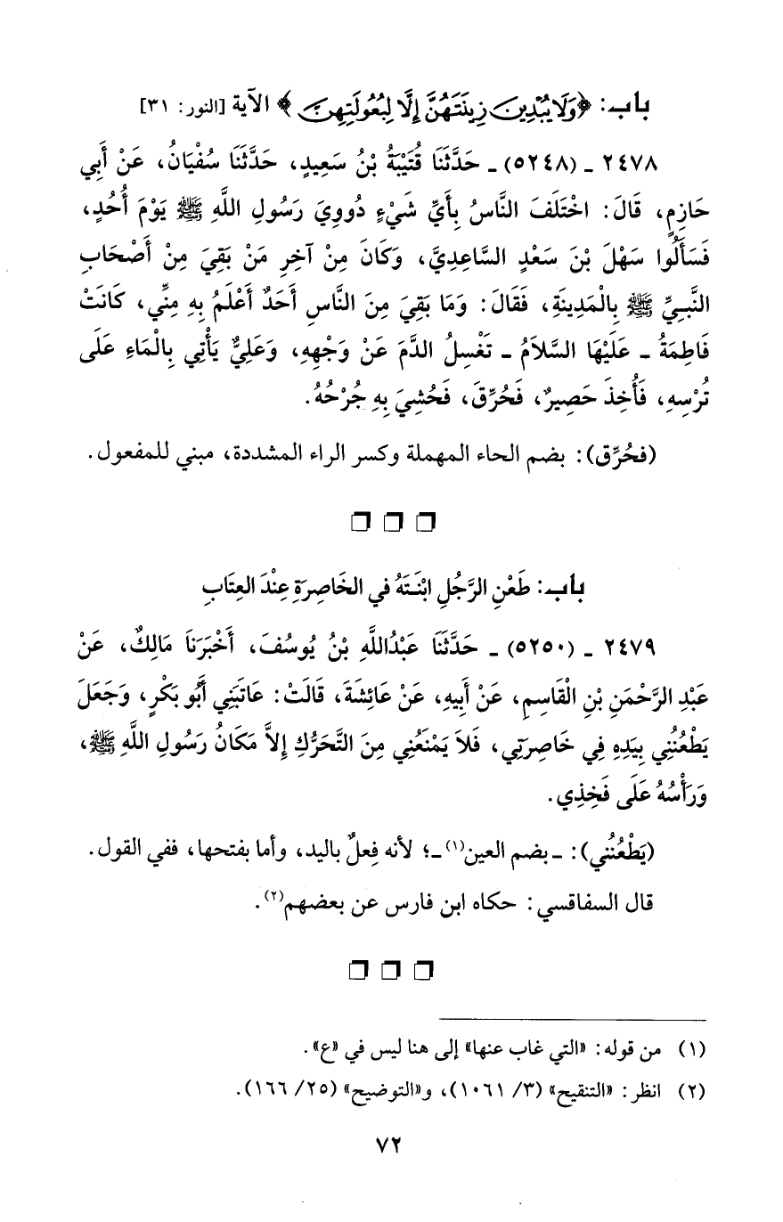 2479 - (5250) - حَدَّثَنَا عَبْدُ اللَّهِ بْنُ يُوسُفَ، أَخْبَرَنا مَالِكٌ، عَنْ عَبْدِ الرَّحْمَنِ بْنِ الْقَاسِم، عَنْ أَبِيهِ، عَنْ عَائِشَةَ، قَالَتْ: عَاتَبَنِي أَبُو بَكْرٍ، وَجَعَلَ يَطْعُنُنِي بِيَدِهِ في خَاصِرَتِي، فَلَا يَمْنَعُنِي مِنَ التَّحَرُّكِ إِلَّا مَكَانُ رَسُولِ اللَّهِ - صلى الله عليه وسلم -، وَرَأْسُهُ عَلَى فَخِذِي.