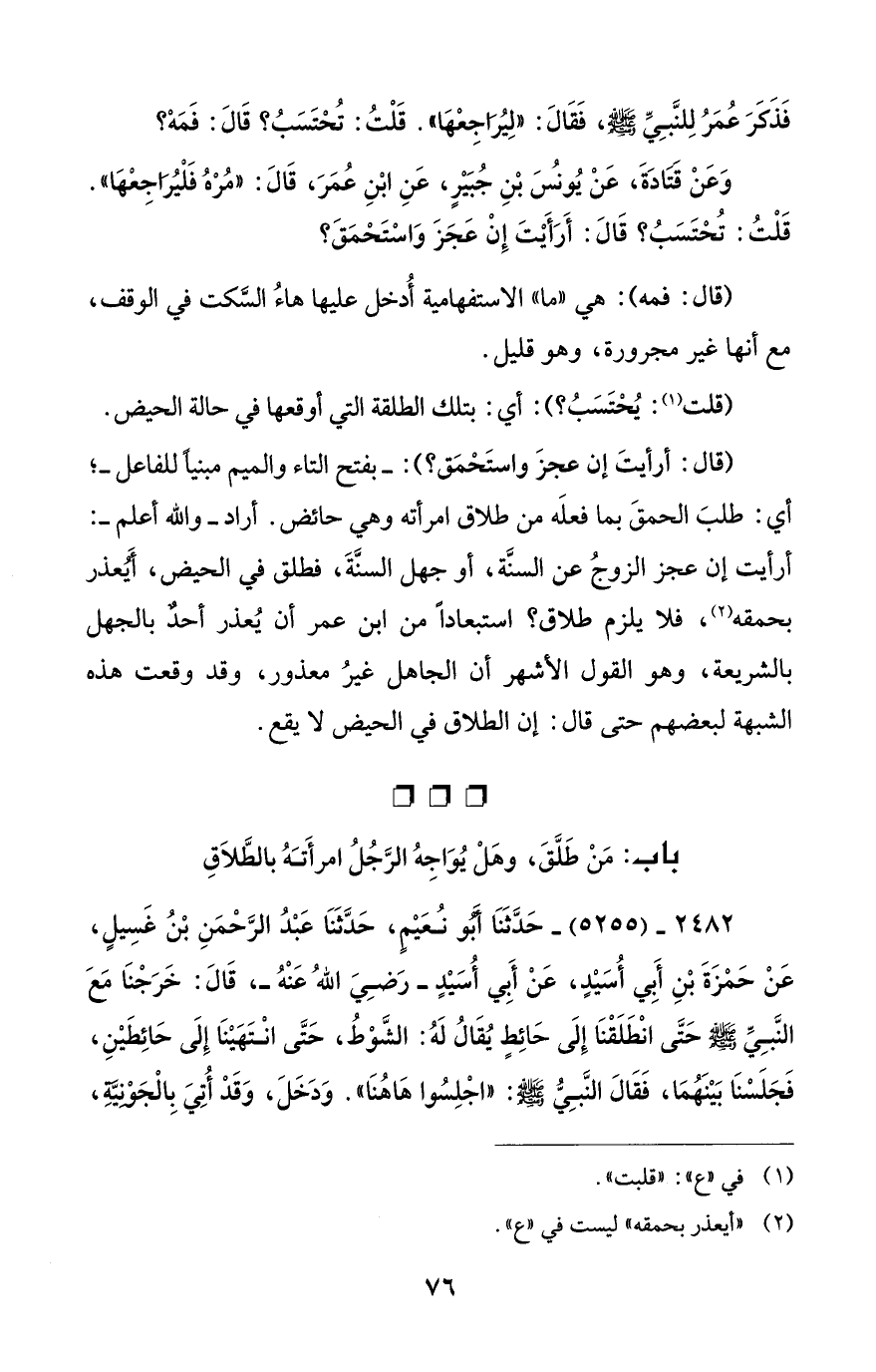 (قال: أرأيتَ إن عجزَ واستَحْمَق؟): -بفتح التاء والميم مبنيًا للفاعل-؛ أي: طلبَ الحمقَ بما فعلَه من طلاق امرأته وهي حائض. أراد -واللَّه أعلم-: أرأيت إن عجز الزوجُ عن السنَّة، أو جهل السنَّةَ، فطلق في الحيض، أَيُعذر بحمقه (¬2)، فلا يلزم طلاق؟ استبعادًا من ابن عمر أن يُعذر أحدٌ بالجهل بالشريعة، وهو القول الأشهر أن الجاهل غيرُ معذور، وقد وقعت هذه الشبهة لبعضهم حتى قال: إن الطلاق في الحيض لا يقع.
