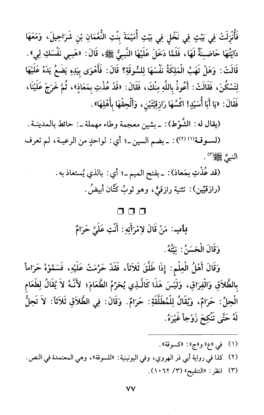 وَقَالَ أَهْلُ الْعِلْم: إِذَا طَلَّقَ ثَلَاثًا، فَقَدْ حَرُمَتْ عَلَيْهِ، فَسَمَّوْهُ حَرَامًا بِالطَّلَاقِ وَالْفِرَاقِ، وَلَيْسَ هَذَا كَالَّذِي يُحَرِّمُ الطَّعَامَ؛ لأَنَّهُ لَا يُقَالُ لِطَعَامِ الْحِلِّ: حَرَامٌ، وَيُقَالُ لِلْمُطَلَّقَةِ: حَرَامٌ. وَقَالَ: في الطَّلَاقِ ثَلَاثًا: لَا تَحِلُّ لَهُ حَتَّى تَنْكِحَ زَوْجًا غَيْرَهُ.
