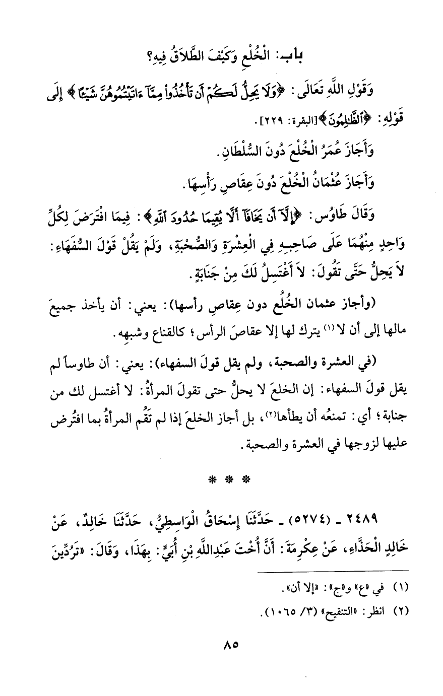 (في العشرة والصحبة، ولم يقل قولَ السفهاء): يعني: أن طاوسًا لم يقل قولَ السفهاء: إن الخلعَ لا يحلُّ حتى تقولَ المرأة: لا أغتسل لك من جنابة؛ أي: تمنعُه أن يطأها (¬2)، بل أجاز الخلعَ إذا لم تقم المرأة وربما افتُرض عليها لزوجها في العشرة والصحبة.