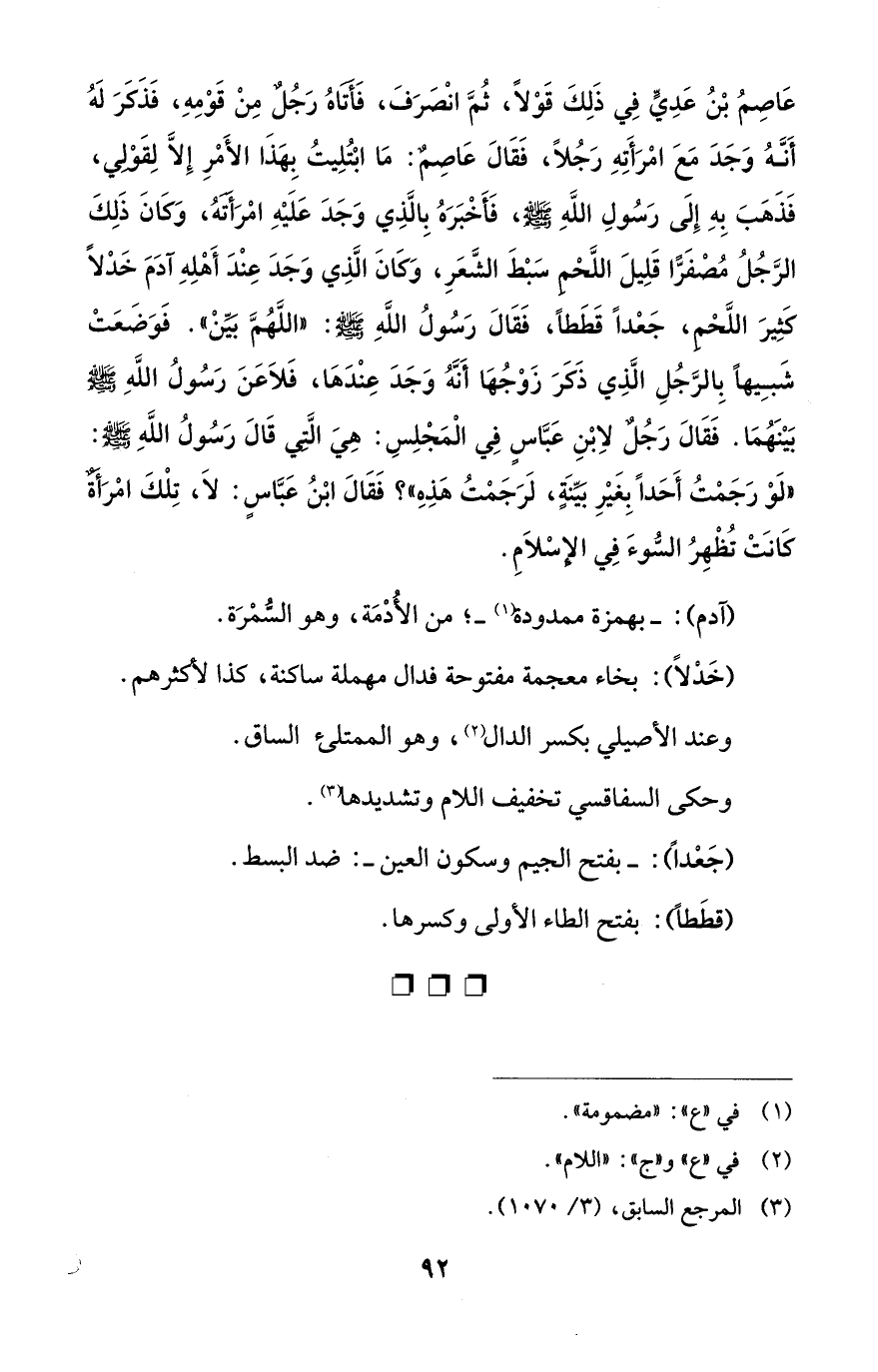 عَاصِمُ بْنُ عَدِيٍّ فِي ذَلِكَ قَوْلًا، ثُمَّ انْصَرَفَ، فَأَتَاهُ رَجُلٌ مِنْ قَوْمِهِ، فَذَكَرَ لَهُ أَنَّهُ وَجَدَ مَعَ امْرَأَتِهِ رَجُلًا، فَقَالَ عَاصِمٌ: مَا ابْتُلِيتُ بِهَذَا الأَمْرِ إِلَّا لِقَوْلِي، فَذَهَبَ بِهِ إِلَى رَسُولِ اللَّهِ - صلى الله عليه وسلم -، فَأَخْبَرَهُ بِالَّذِي وَجَدَ عَلَيْهِ امْرَأتهُ، وَكَانَ ذَلِكَ الرَّجُلُ مُصْفَرًّا قَلِيلَ اللَّحْم سَبْطَ الشَّعَرِ، وَكَانَ الَّذِي وَجَدَ عِنْدَ أَهْلِهِ آدَمَ خَدْلًا كَثِيرَ اللَّحْمِ، جَعْدًا قَطَطًا، فَقَالَ رَسُولُ اللَّهِ - صلى الله عليه وسلم -: "اللَّهُمَّ بَيِّنْ". فَوَضَعَتْ شَبِيهًا بِالرَّجُلِ الَّذِي ذَكَرَ زَوْجُهَا أَنَّهُ وَجَدَ عِنْدَهَا، فَلَاعَنَ رَسُولُ اللَّهِ - صلى الله عليه وسلم - بَيْنَهُمَا. فَقَالَ رَجُلٌ لاِبْنِ عَبَّاسٍ فِي الْمَجْلِسِ: هِيَ الَّتِي قَالَ رَسُولُ اللَّهِ - صلى الله عليه وسلم -: "لَوْ رَجَمْتُ أَحَدًا بِغَيْرِ بَيِّنَةٍ، لَرَجَمْتُ هَذِهِ"؟ فَقَالَ ابْنُ عَبَّاسٍ: لَا، تِلْكَ امْرَأةٌ كَانَتْ تُظْهِرُ السُّوءَ فِي الإسْلَامِ.
