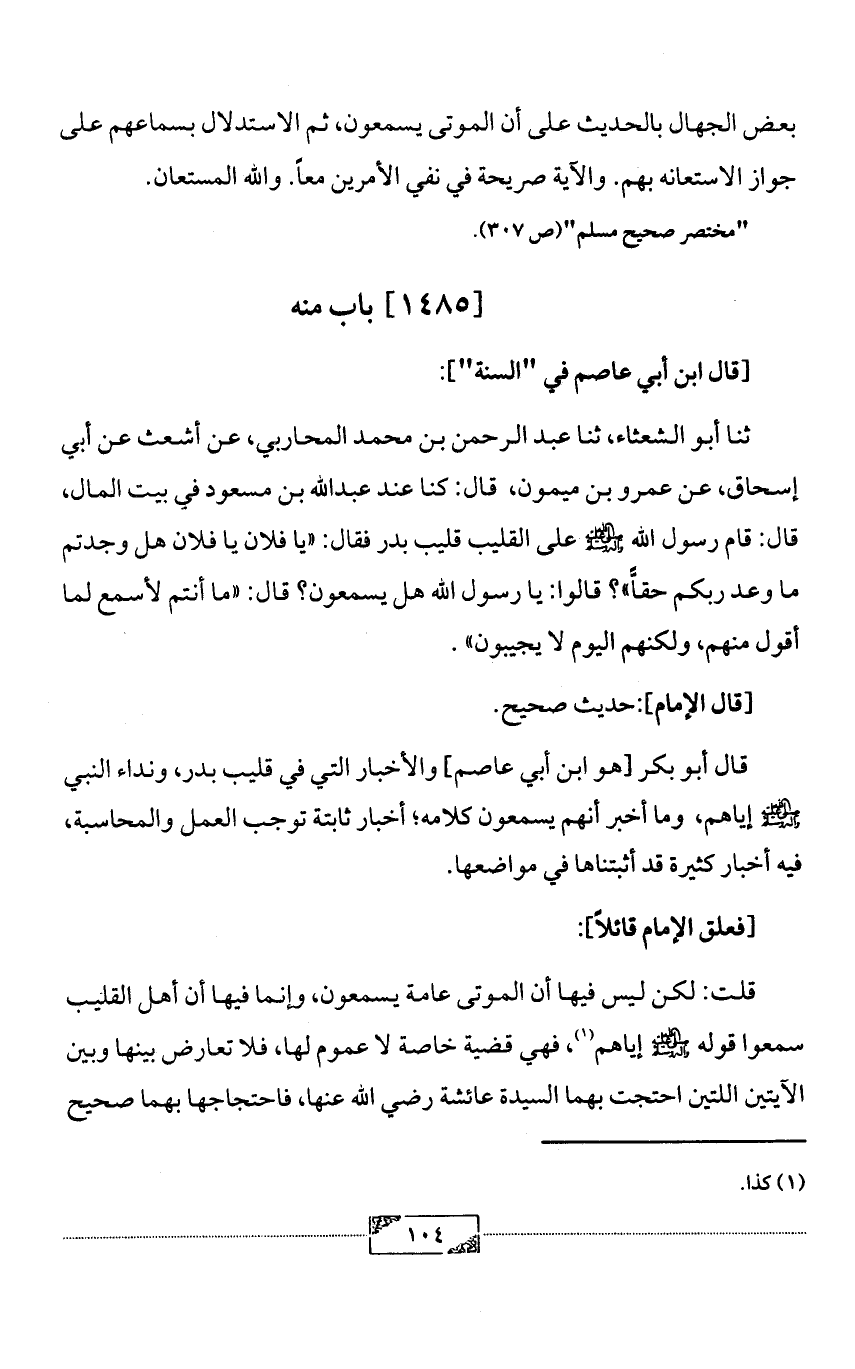 قال أبو بكر [هو ابن أبي عاصم] والأخبار التي في قليب بدر، ونداء النبي - صلى الله عليه وآله وسلم - إياهم، وما أخبر أنهم يسمعون كلامه؛ أخبار ثابتة توجب العمل والمحاسبة، فيه أخبار كثيرة قد أثبتناها في مواضعها.