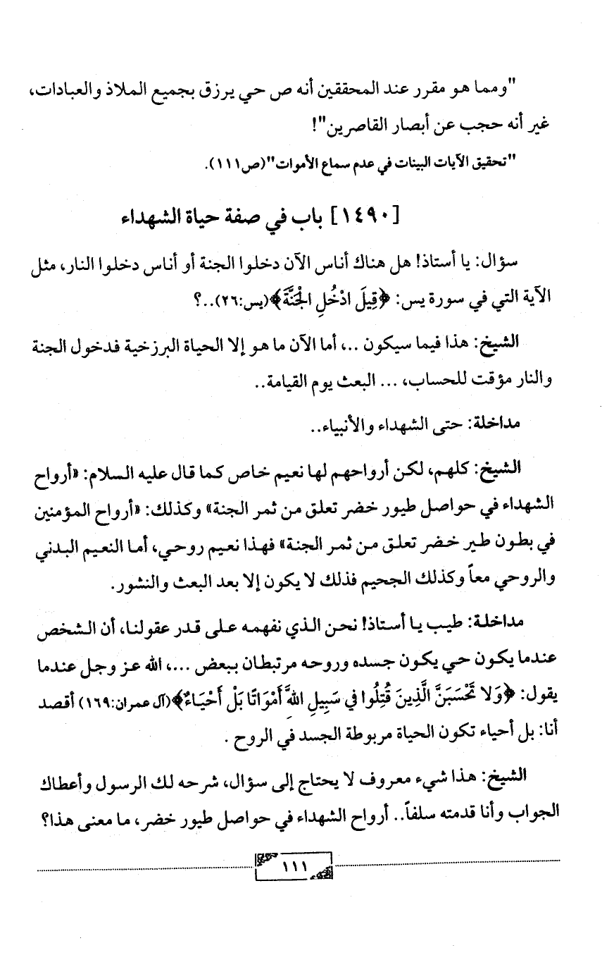 الشيخ: هذا شيء معروف لا يحتاج إلى سؤال، شرحه لك الرسول وأعطاك الجواب وأنا قدمته سلفاً .. أرواح الشهداء في حواصل طيور خضر، ما معنى هذا؟