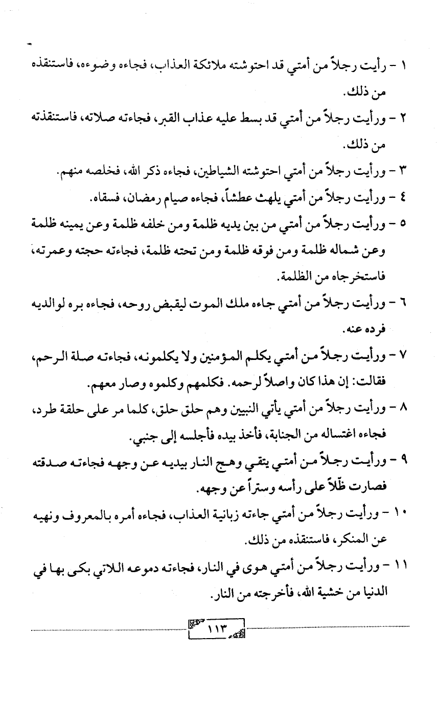 10 - ورأيت رجلاً من أمتي جاءته زبانية العذاب, فجاءه أمره بالمعروف ونهيه عن المنكر, فاستنقذه من ذلك.