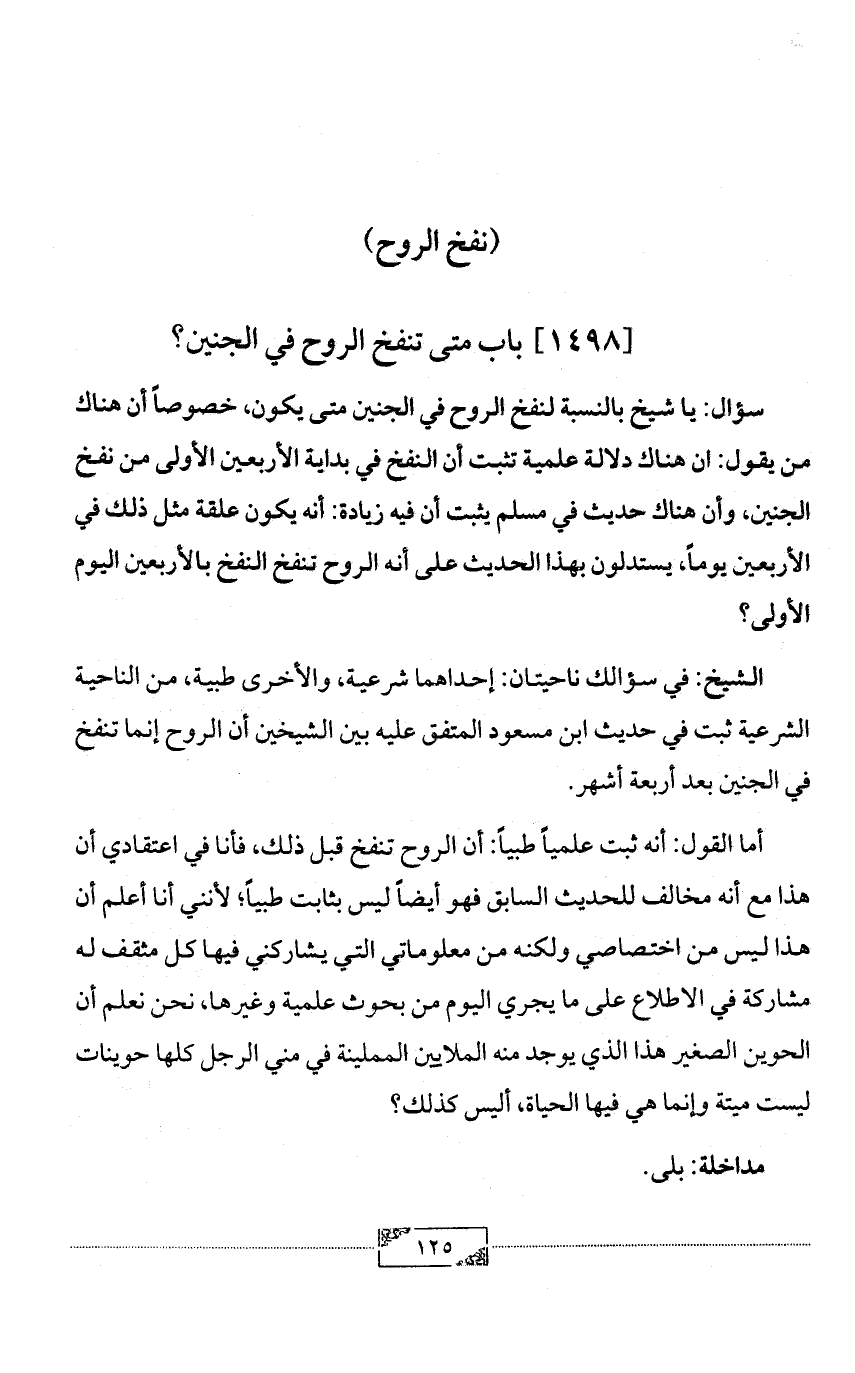 سؤال: يا شيخ بالنسبة لنفخ الروح في الجنين متى يكون، خصوصاً أن هناك من يقول: ان هناك دلالة علمية تثبت أن النفخ في بداية الأربعين الأولى من نفخ الجنين، وأن هناك حديث في مسلم يثبت أن فيه زيادة: أنه يكون علقة مثل ذلك في الأربعين يوماً، يستدلون بهذا الحديث على أنه الروح تنفخ النفخ بالأربعين اليوم الأولى؟