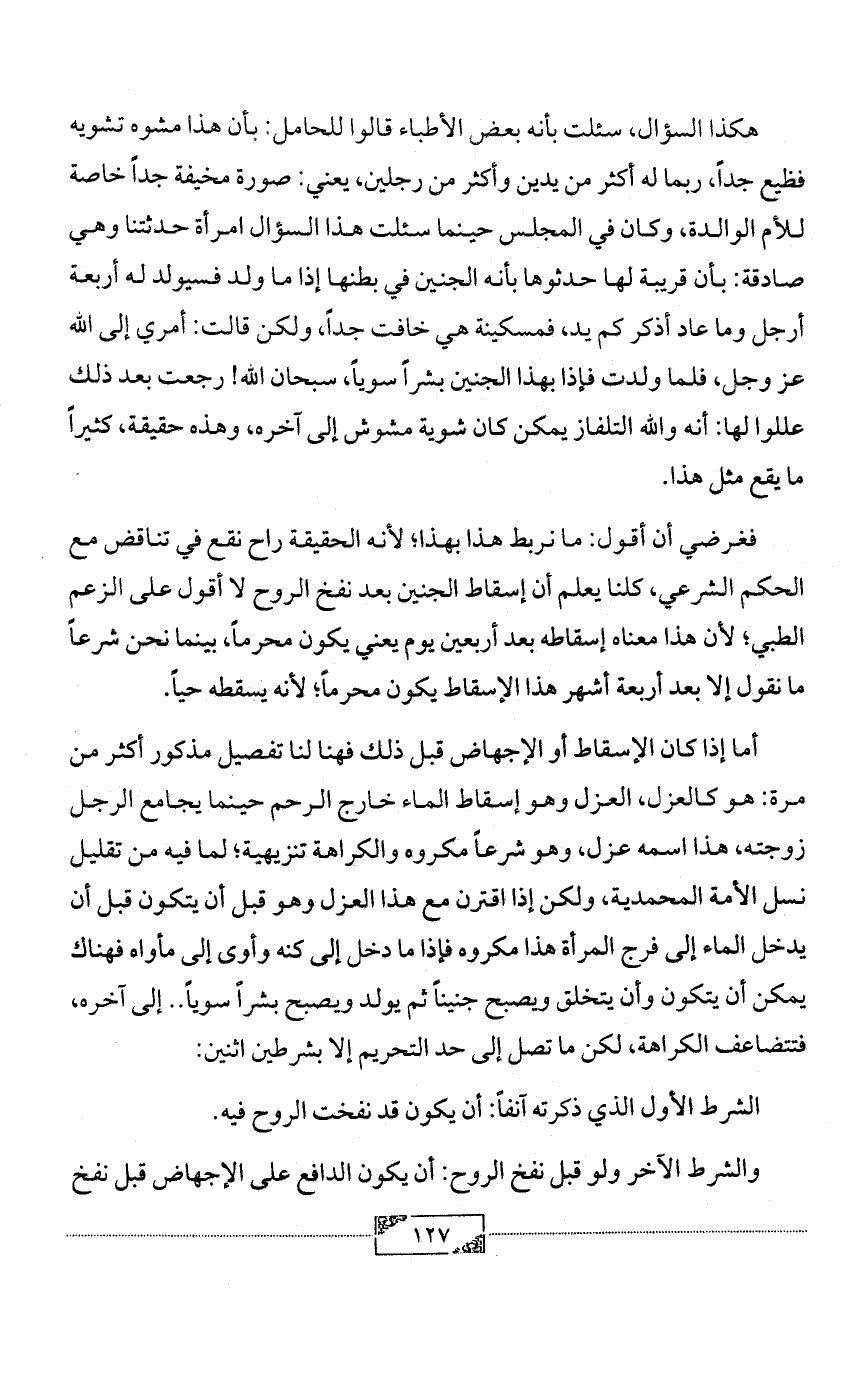 أما إذا كان الإسقاط أو الإجهاض قبل ذلك فهنا لنا تفصيل مذكور أكثر من مرة: هو كالعزل، العزل وهو إسقاط الماء خارج الرحم حينما يجامع الرجل زوجته، هذا اسمه عزل، وهو شرعاً مكروه والكراهة تنزيهية؛ لما فيه من تقليل نسل الأمة المحمدية، ولكن إذا اقترن مع هذا العزل وهو قبل أن يتكون قبل أن يدخل الماء إلى فرج المرأة هذا مكروه فإذا ما دخل إلى كنه وأوى إلى مأواه فهناك يمكن أن يتكون وأن يتخلق ويصبح جنيناً ثم يولد ويصبح بشراً سوياً .. إلى آخره، فتتضاعف الكراهة، لكن ما تصل إلى حد التحريم إلا بشرطين اثنين: