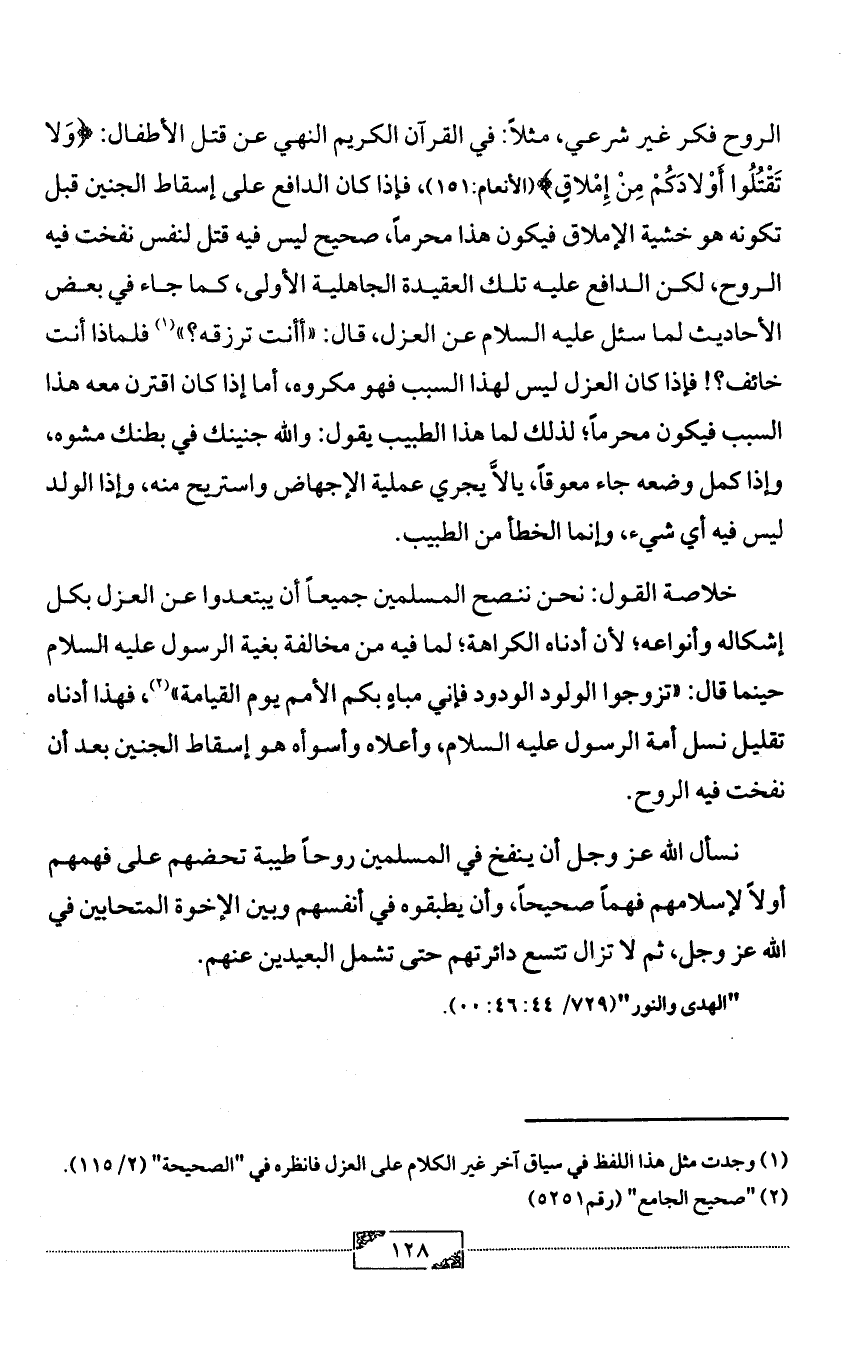 خلاصة القول: نحن ننصح المسلمين جميعاً أن يبتعدوا عن العزل بكل إشكاله وأنواعه؛ لأن أدناه الكراهة؛ لما فيه من مخالفة بغية الرسول عليه السلام حينما قال: «تزوجوا الولود الودود فإني مباهٍ بكم الأمم يوم القيامة» (¬2)، فهذا أدناه تقليل نسل أمة الرسول عليه السلام، وأعلاه وأسوأه هو إسقاط الجنين بعد أن نفخت فيه الروح.