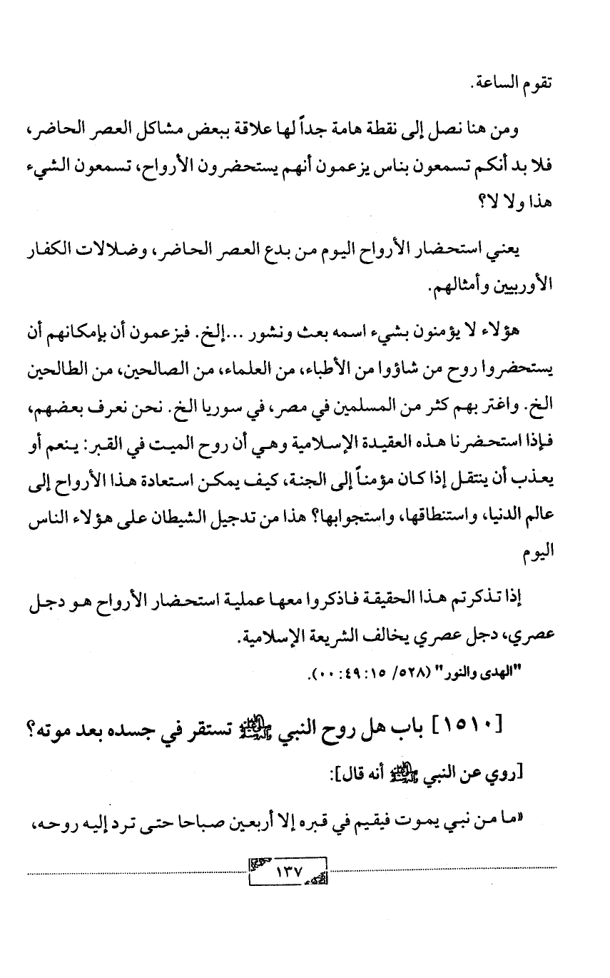هؤلاء لا يؤمنون بشيء اسمه بعث ونشور ... إلخ. فيزعمون أن بإمكانهم أن يستحضروا روح من شاؤوا من الأطباء، من العلماء، من الصالحين، من الطالحين الخ. واغتر بهم كثر من المسلمين في مصر، في سوريا الخ. نحن نعرف بعضهم، فإذا استحضرنا هذه العقيدة الإسلامية وهي أن روح الميت في القبر: ينعم أو يعذب أن ينتقل إذا كان مؤمناً إلى الجنة، كيف يمكن استعادة هذا الأرواح إلى عالم الدنيا، واستنطاقها، واستجوابها؟ هذا من تدجيل الشيطان على هؤلاء الناس اليوم