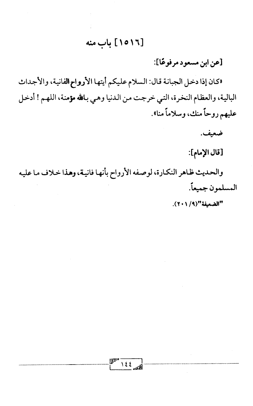 «كان إذا دخل الجبانة قال: السلام عليكم أيتها الأرواح الفانية، والأجداث البالية، والعظام النخرة، التي خرجت من الدنيا وهي بالله مؤمنة، اللهم! أدخل عليهم روحاً منك، وسلاماً منا».