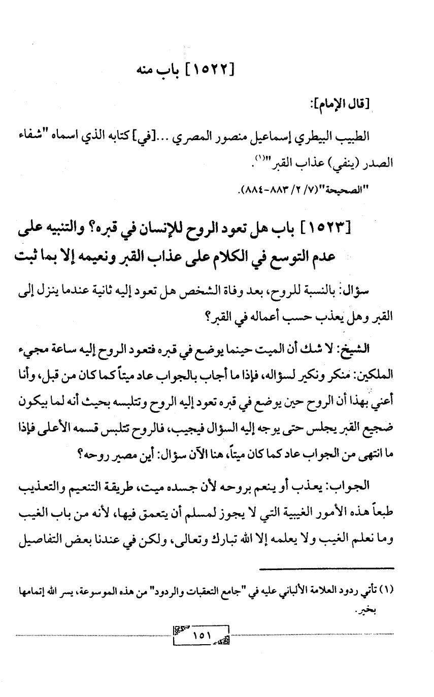 [1523] باب هل تعود الروح للإنسان في قبره؟ والتنبيه على عدم التوسع في الكلام على عذاب القبر ونعيمه إلا بما ثبت