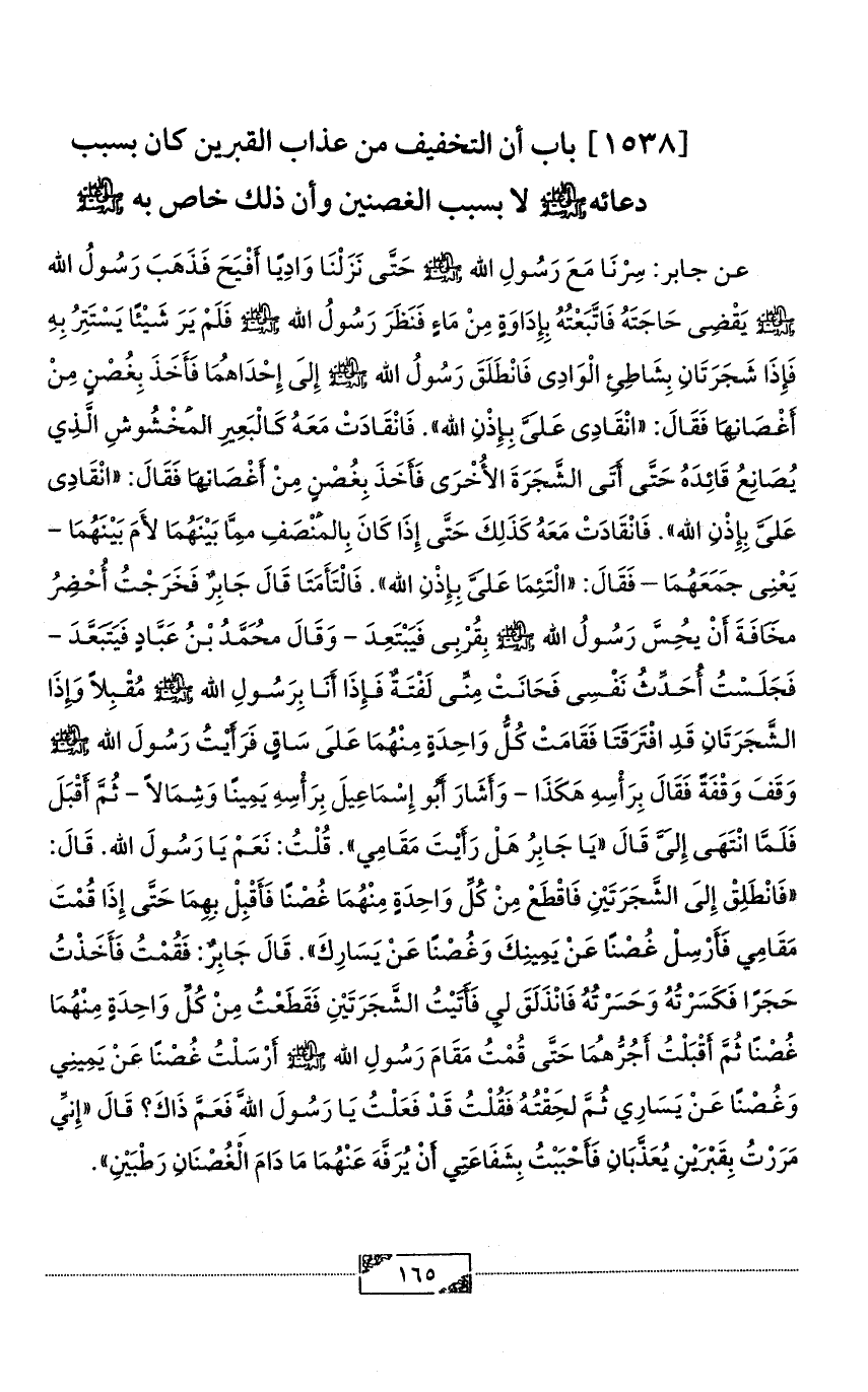 عن جابر: سِرْنَا مَعَ رَسُولِ الله - صلى الله عليه وآله وسلم - حَتَّى نَزَلْنَا وَادِيًا أَفْيَحَ فَذَهَبَ رَسُولُ الله - صلى الله عليه وآله وسلم - يَقْضِى حَاجَتَهُ فَاتَّبَعْتُهُ بِإِدَاوَةٍ مِنْ مَاءٍ فَنَظَرَ رَسُولُ الله - صلى الله عليه وآله وسلم - فَلَمْ يَرَ شَيْئًا يَسْتَتِرُ بِهِ فَإِذَا شَجَرَتَانِ بِشَاطِئِ الْوَادِى فَانْطَلَقَ رَسُولُ الله - صلى الله عليه وآله وسلم - إِلَى إِحْدَاهُمَا فَأَخَذَ بِغُصْنٍ مِنْ أَغْصَانِهَا فَقَالَ: «انْقَادِى عَلَىَّ بِإِذْنِ الله». فَانْقَادَتْ مَعَهُ كَالْبَعِيرِ الْمَخْشُوشِ الَّذِي يُصَانِعُ قَائِدَهُ حَتَّى أَتَى الشَّجَرَةَ الأُخْرَى فَأَخَذَ بِغُصْنٍ مِنْ أَغْصَانِهَا فَقَالَ: «انْقَادِى عَلَىَّ بِإِذْنِ الله». فَانْقَادَتْ مَعَهُ كَذَلِكَ حَتَّى إِذَا كَانَ بِالْمَنْصَفِ مِمَّا بَيْنَهُمَا لأَمَ بَيْنَهُمَا - يَعْنِى جَمَعَهُمَا - فَقَالَ: «الْتَئِمَا عَلَىَّ بِإِذْنِ الله». فَالْتَأَمَتَا قَالَ جَابِرٌ فَخَرَجْتُ أُحْضِرُ مَخَافَةَ أَنْ يُحِسَّ رَسُولُ الله - صلى الله عليه وآله وسلم - بِقُرْبِى فَيَبْتَعِدَ - وَقَالَ مُحَمَّدُ بْنُ عَبَّادٍ فَيَتَبَعَّدَ - فَجَلَسْتُ أُحَدِّثُ نَفْسِى فَحَانَتْ مِنِّى لَفْتَةٌ فَإِذَا أَنَا بِرَسُولِ الله - صلى الله عليه وآله وسلم - مُقْبِلاً وَإِذَا الشَّجَرَتَانِ قَدِ افْتَرَقَتَا فَقَامَتْ كُلُّ وَاحِدَةٍ مِنْهُمَا عَلَى سَاقٍ فَرَأَيْتُ رَسُولَ الله - صلى الله عليه وآله وسلم - وَقَفَ وَقْفَةً فَقَالَ بِرَأْسِهِ هَكَذَا - وَأَشَارَ أَبُو إِسْمَاعِيلَ بِرَأْسِهِ يَمِينًا وَشِمَالاً - ثُمَّ أَقْبَلَ فَلَمَّا انْتَهَى إِلَىَّ قَالَ «يَا جَابِرُ هَلْ رَأَيْتَ مَقَامِي». قُلْتُ: نَعَمْ يَا رَسُولَ الله. قَالَ: «فَانْطَلِقْ إِلَى الشَّجَرَتَيْنِ فَاقْطَعْ مِنْ كُلِّ وَاحِدَةٍ مِنْهُمَا غُصْنًا فَأَقْبِلْ بِهِمَا حَتَّى إِذَا قُمْتَ مَقَامِي فَأَرْسِلْ غُصْنًا عَنْ يَمِينِكَ وَغُصْنًا عَنْ يَسَارِكَ». قَالَ جَابِرٌ: فَقُمْتُ فَأَخَذْتُ حَجَرًا فَكَسَرْتُهُ وَحَسَرْتُهُ فَانْذَلَقَ لِي فَأَتَيْتُ الشَّجَرَتَيْنِ فَقَطَعْتُ مِنْ كُلِّ وَاحِدَةٍ مِنْهُمَا غُصْنًا ثُمَّ أَقْبَلْتُ أَجُرُّهُمَا حَتَّى قُمْتُ مَقَامَ رَسُولِ الله - صلى الله عليه وآله وسلم - أَرْسَلْتُ غُصْنًا عَنْ يَمِينِي وَغُصْنًا عَنْ يَسَارِي ثُمَّ لَحِقْتُهُ فَقُلْتُ قَدْ فَعَلْتُ يَا رَسُولَ اللَّهِ فَعَمَّ ذَاكَ؟ قَالَ «إِنِّي مَرَرْتُ بِقَبْرَيْنِ يُعَذَّبَانِ فَأَحْبَبْتُ بِشَفَاعَتِي أَنْ يُرَفَّهَ عَنْهُمَا مَا دَامَ الْغُصْنَانِ رَطْبَيْنِ».