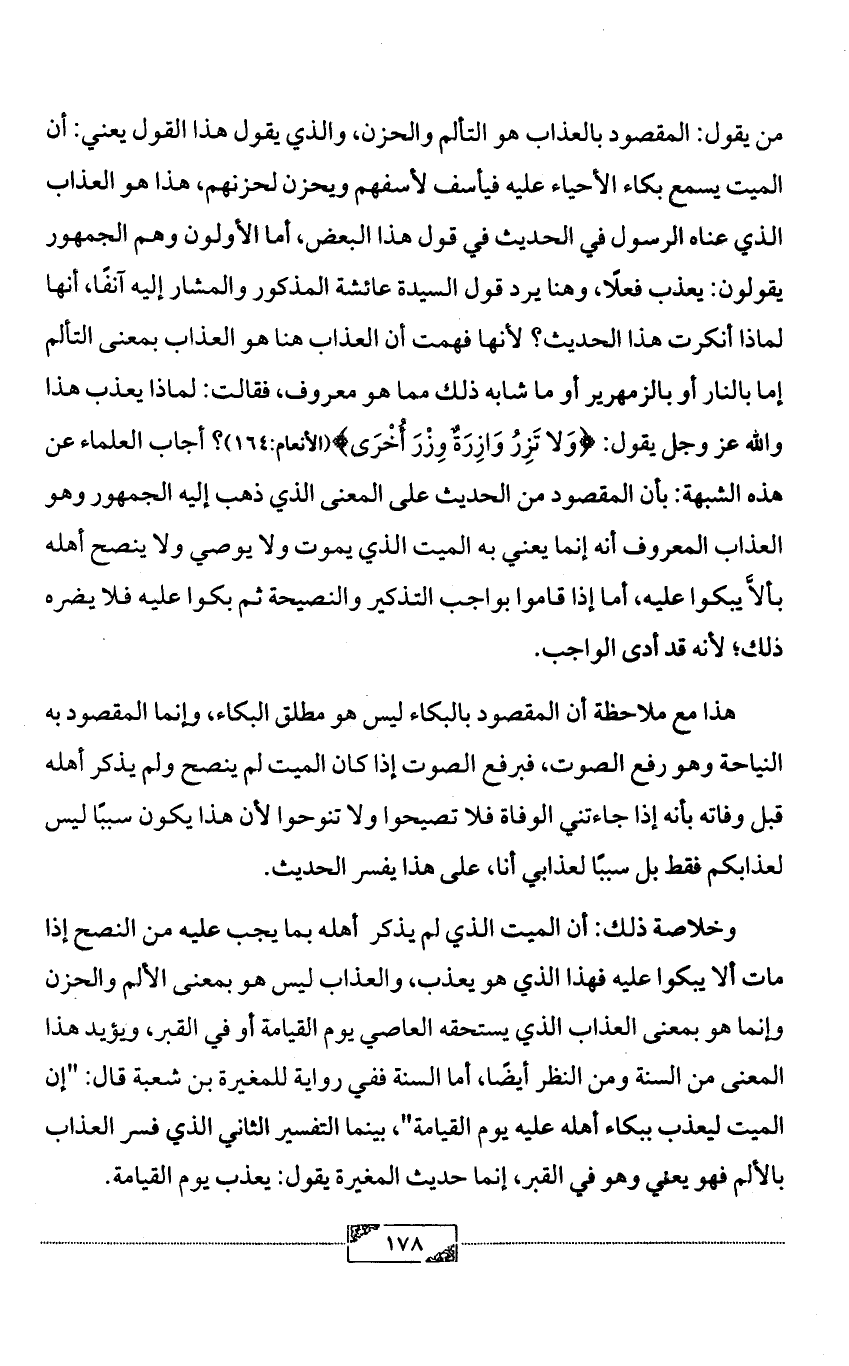 وخلاصة ذلك: أن الميت الذي لم يذكر أهله بما يجب عليه من النصح إذا مات ألا يبكوا عليه فهذا الذي هو يعذب، والعذاب ليس هو بمعنى الألم والحزن وإنما هو بمعنى العذاب الذي يستحقه العاصي يوم القيامة أو في القبر، ويؤيد هذا المعنى من السنة ومن النظر أيضًا، أما السنة ففي رواية للمغيرة بن شعبة قال: "إن الميت ليعذب ببكاء أهله عليه يوم القيامة"، بينما التفسير الثاني الذي فسر العذاب بالألم فهو يعني وهو في القبر، إنما حديث المغيرة يقول: يعذب يوم القيامة.