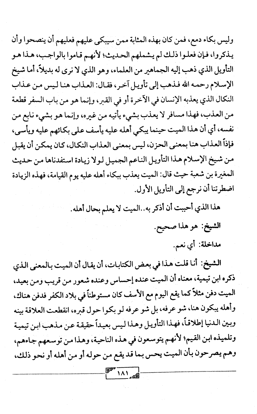 الشيخ: أنا قلت هذا في بعض الكتابات، أن يقال أن الميت بالمعنى الذي ذكره ابن تيمية، معناه أن الميت عنده إحساس وعنده شعور من قريب ومن بعيد، الميت دفن مثلاً كما يقع اليوم مع الأسف كان مستوطناً في بلاد الكفر فدفن هناك، وأهله يبكون هنا، شو عرفه، بل شو عرفه لو بكوا حول قبره، انقطعت العلاقة بينه وبين الدنيا إطلاقاً، فهذا التأويل وهذا ليس بعيداً حقيقة عن مذهب ابن تيمية وتلميذه ابن القيم؛ لأنهم يتوسعون في هذه الناحية، وهذا من توسعهم جاءهم، وهم يصرحون بأن الميت يحس بما قد يقع من حوله أو من أهله أو نحو ذلك،