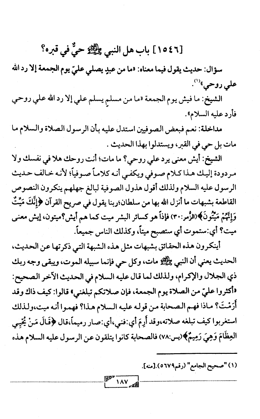 الشيخ: أيش معنى يرد علي روحي؟ ما مات؛ أنت روحك هلا في نفسك ولا مردودة إليك هذا كلام صوفي ويكفي أنه كلاماً صوفياً؛ لأنه خالف حديث الرسول عليه السلام ولذلك أقول هذول الصوفية لبالغ جهلهم ينكرون النصوص القاطعة بشبهات ما أنزل الله بها من سلطان؛ ربنا يقول في صريح القرآن {إِنَّكَ مَيِّتٌ وَإِنَّهُمْ مَيِّتُونَ} (الزُّمر:30) فإذاً هو كسائر البشر ميت كما هم أيش؟ ميتون، إيش معنى ميت؟ أي: ستموت أي ستصبح ميتاً، وكذلك الناس جميعاً.