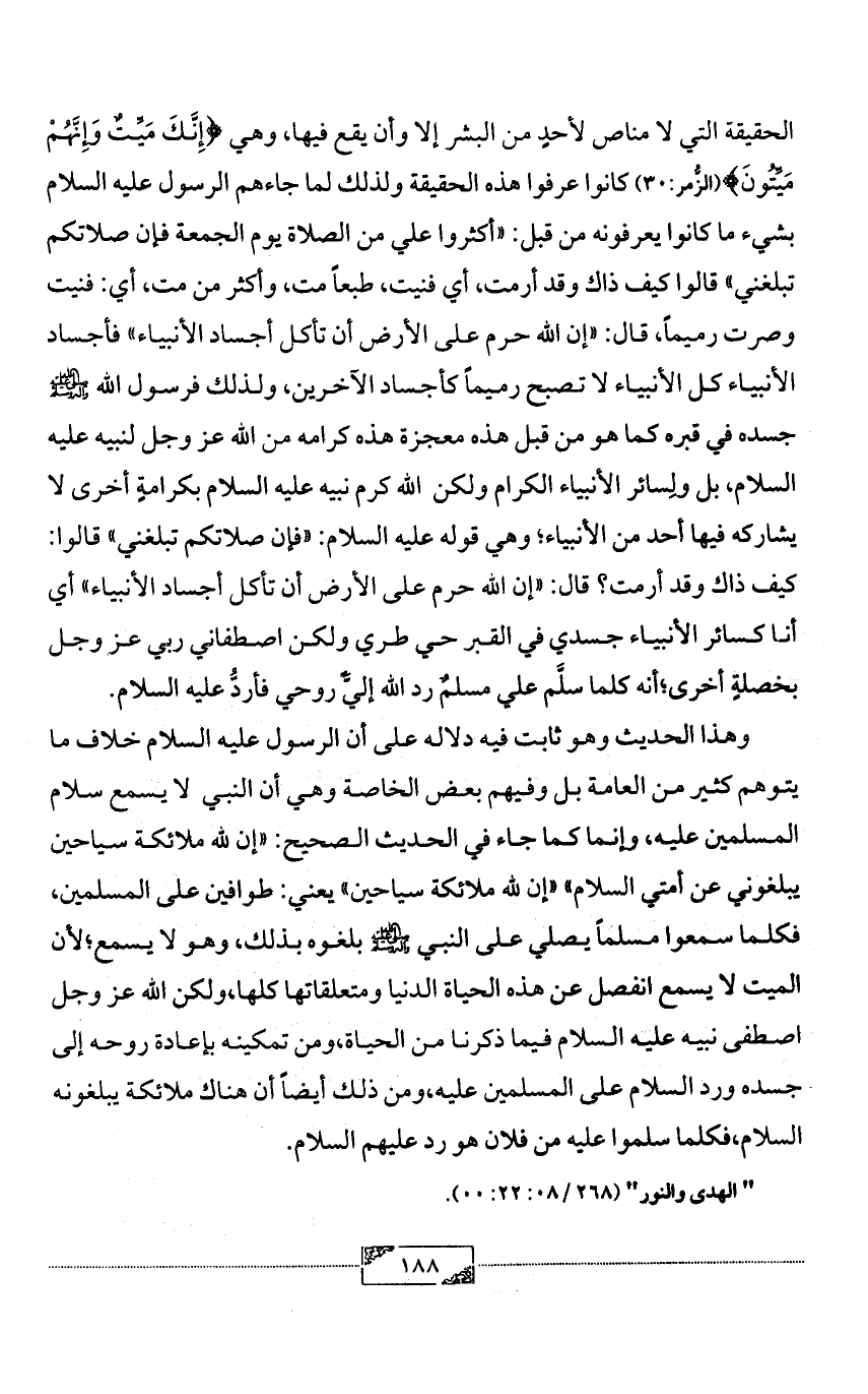 الحقيقة التي لا مناص لأحدٍ من البشر إلا وأن يقع فيها، وهي {إِنَّكَ مَيِّتٌ وَإِنَّهُمْ مَيِّتُونَ} (الزُّمر:30) كانوا عرفوا هذه الحقيقة ولذلك لما جاءهم الرسول عليه السلام بشيء ما كانوا يعرفونه من قبل: «أكثروا علي من الصلاة يوم الجمعة فإن صلاتكم تبلغني» قالوا كيف ذاك وقد أرمت، أي فنيت، طبعاً مت، وأكثر من مت، أي: فنيت وصرت رميماً، قال: «إن الله حرم على الأرض أن تأكل أجساد الأنبياء» فأجساد الأنبياء كل الأنبياء لا تصبح رميماً كأجساد الآخرين، ولذلك فرسول الله - صلى الله عليه وآله وسلم - جسده في قبره كما هو من قبل هذه معجزة هذه كرامه من الله عز وجل لنبيه عليه السلام، بل ولِسائر الأنبياء الكرام ولكن الله كرم نبيه عليه السلام بكرامةٍ أخرى لا يشاركه فيها أحد من الأنبياء؛ وهي قوله عليه السلام: «فإن صلاتكم تبلغني» قالوا: كيف ذاك وقد أرمت؟ قال: «إن الله حرم على الأرض أن تأكل أجساد الأنبياء» أي أنا كسائر الأنبياء جسدي في القبر حي طري ولكن اصطفاني ربي عز وجل بخصلةٍ أخرى؛ أنه كلما سلَّم علي مسلمٌ رد الله إليًَّ روحي فأردُّ عليه السلام.
