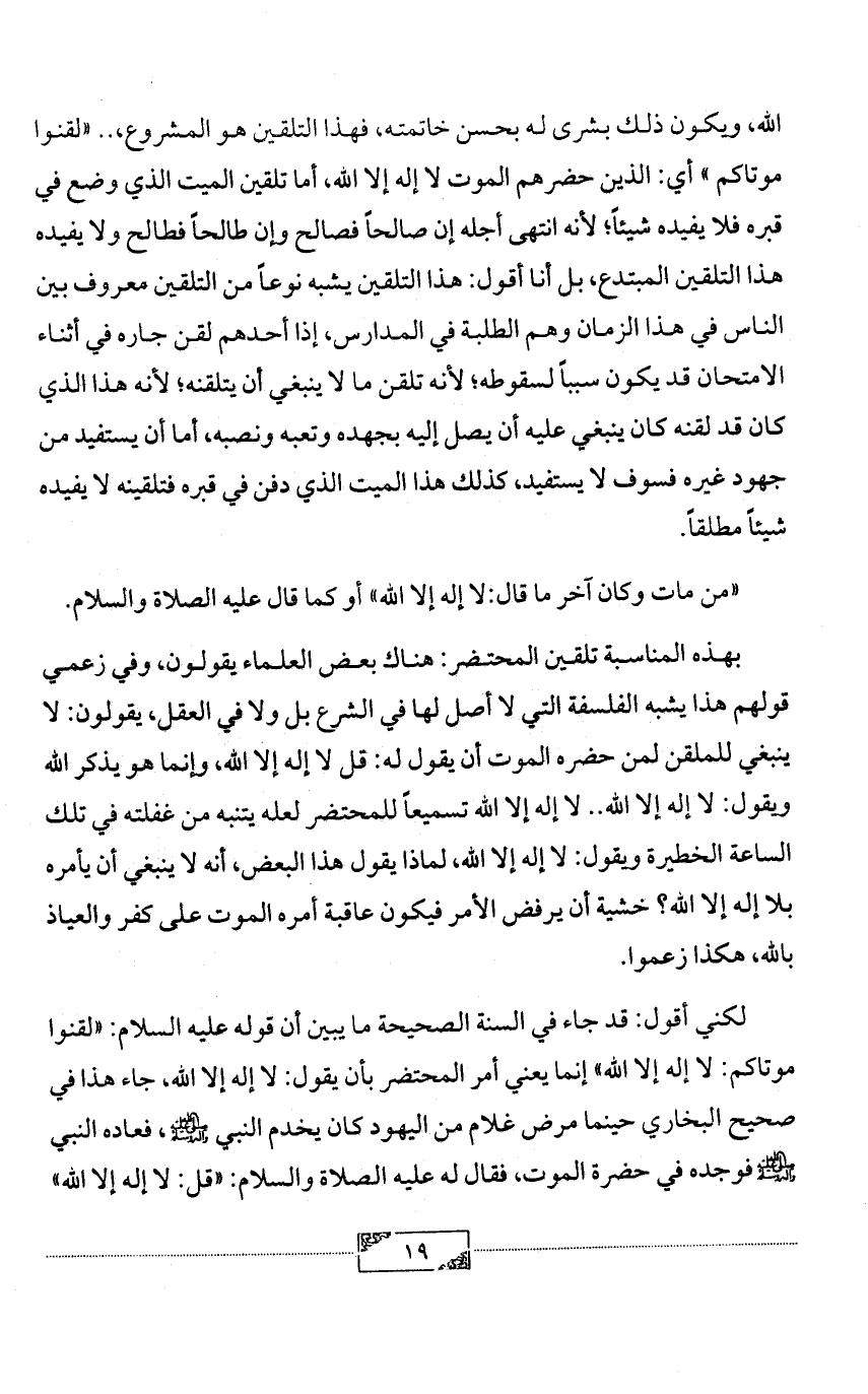 بهذه المناسبة تلقين المحتضر: هناك بعض العلماء يقولون، وفي زعمي قولهم هذا يشبه الفلسفة التي لا أصل لها في الشرع بل ولا في العقل، يقولون: لا ينبغي للملقن لمن حضره الموت أن يقول له: قل لا إله إلا الله، وإنما هو يذكر الله ويقول: لا إله إلا الله .. لا إله إلا الله تسميعاً للمحتضر لعله يتنبه من غفلته في تلك الساعة الخطيرة ويقول: لا إله إلا الله، لماذا يقول هذا البعض، أنه لا ينبغي أن يأمره بلا إله إلا الله؟ خشية أن يرفض الأمر فيكون عاقبة أمره الموت على كفر والعياذ بالله، هكذا زعموا.