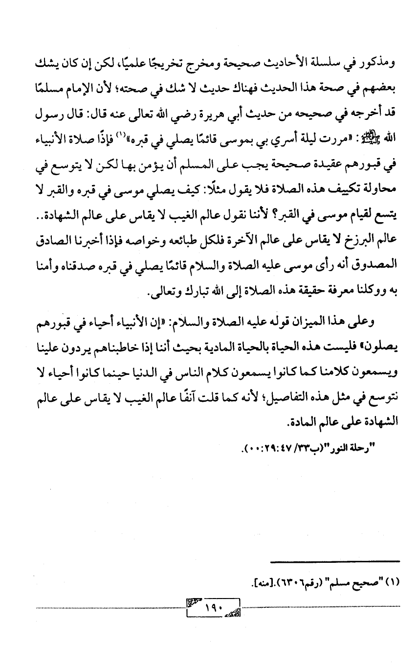 وعلى هذا الميزان قوله عليه الصلاة والسلام: «إن الأنبياء أحياء في قبورهم يصلون» فليست هذه الحياة بالحياة المادية بحيث أننا إذا خاطبناهم يردون علينا ويسمعون كلامنا كما كانوا يسمعون كلام الناس في الدنيا حينما كانوا أحياء لا نتوسع في مثل هذه التفاصيل؛ لأنه كما قلت آنفًا عالم الغيب لا يقاس على عالم الشهادة على عالم المادة.