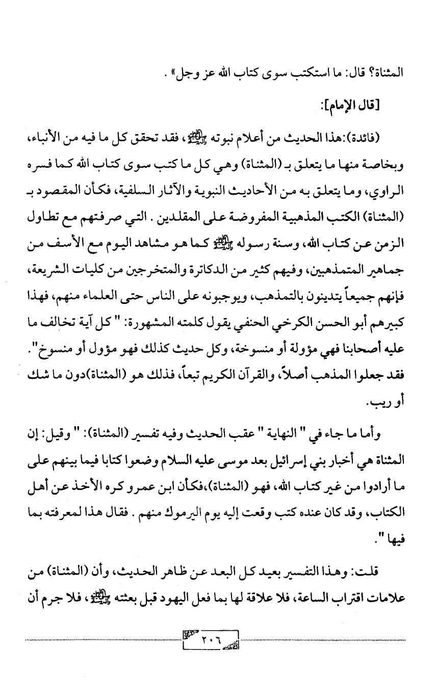 (فائدة):هذا الحديث من أعلام نبوته - صلى الله عليه وآله وسلم -، فقد تحقق كل ما فيه من الأنباء، وبخاصة منها ما يتعلق بـ (المثناة) وهي كل ما كتب سوى كتاب الله كما فسره الراوي، وما يتعلق به من الأحاديث النبوية والآثار السلفية، فكأن المقصود بـ (المثناة) الكتب المذهبية المفروضة على المقلدين. التي صرفتهم مع تطاول الزمن عن كتاب الله، وسنة رسوله - صلى الله عليه وآله وسلم - كما هو مشاهد اليوم مع الأسف من جماهير المتمذهبين، وفيهم كثير من الدكاترة والمتخرجين من كليات الشريعة، فإنهم جميعاً يتدينون بالتمذهب، ويوجبونه على الناس حتى العلماء منهم، فهذا كبيرهم أبو الحسن الكرخي الحنفي يقول كلمته المشهورة: " كل آية تخالف ما عليه أصحابنا فهي مؤولة أو منسوخة، وكل حديث كذلك فهو مؤول أو منسوخ". فقد جعلوا المذهب أصلاً، والقرآن الكريم تبعاً، فذلك هو (المثناة) دون ما شك