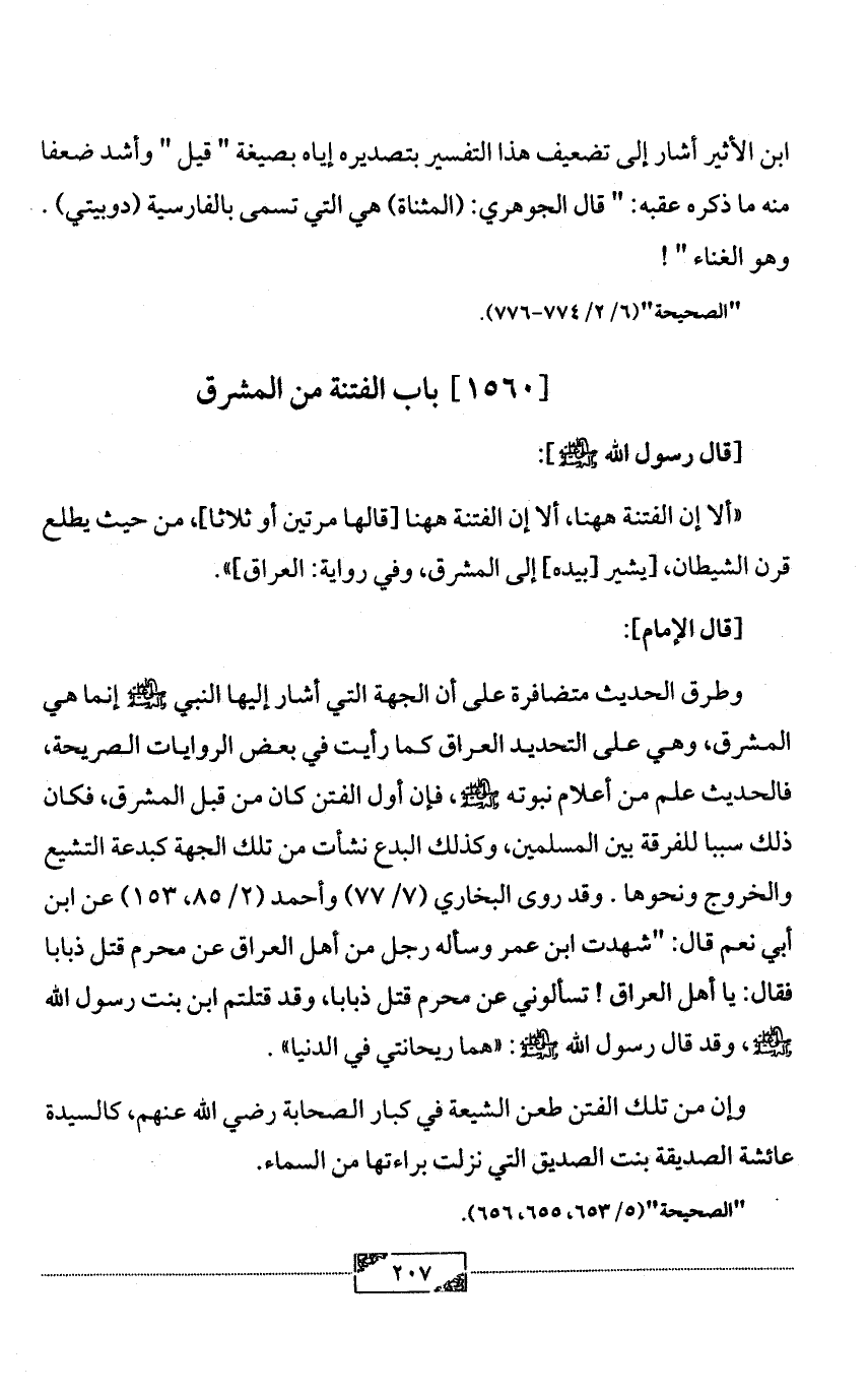 وطرق الحديث متضافرة على أن الجهة التي أشار إليها النبي - صلى الله عليه وآله وسلم - إنما هي المشرق، وهي على التحديد العراق كما رأيت في بعض الروايات الصريحة، فالحديث علم من أعلام نبوته - صلى الله عليه وآله وسلم -، فإن أول الفتن كان من قبل المشرق، فكان ذلك سببا للفرقة بين المسلمين، وكذلك البدع نشأت من تلك الجهة كبدعة التشيع والخروج ونحوها. وقد روى البخاري (7/ 77) وأحمد (2/ 85، 153) عن ابن أبي نعم قال: "شهدت ابن عمر وسأله رجل من أهل العراق عن محرم قتل ذبابا فقال: يا أهل العراق! تسألوني عن محرم قتل ذبابا، وقد قتلتم ابن بنت رسول الله - صلى الله عليه وآله وسلم -، وقد قال رسول الله - صلى الله عليه وآله وسلم -: «هما ريحانتي في الدنيا».