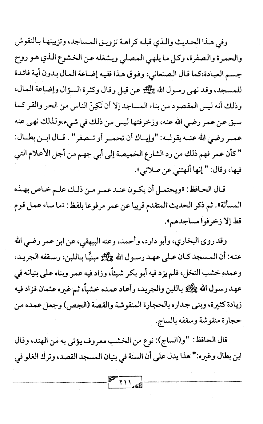 قال الحافظ: «ويحتمل أن يكون عند عمر من ذلك علم خاص بهذه المسألة». ثم ذكر الحديث المتقدم قريبا عن عمر مرفوعا بلفظ: «ما ساء عمل قوم قط إلا زخرفوا مساجدهم».