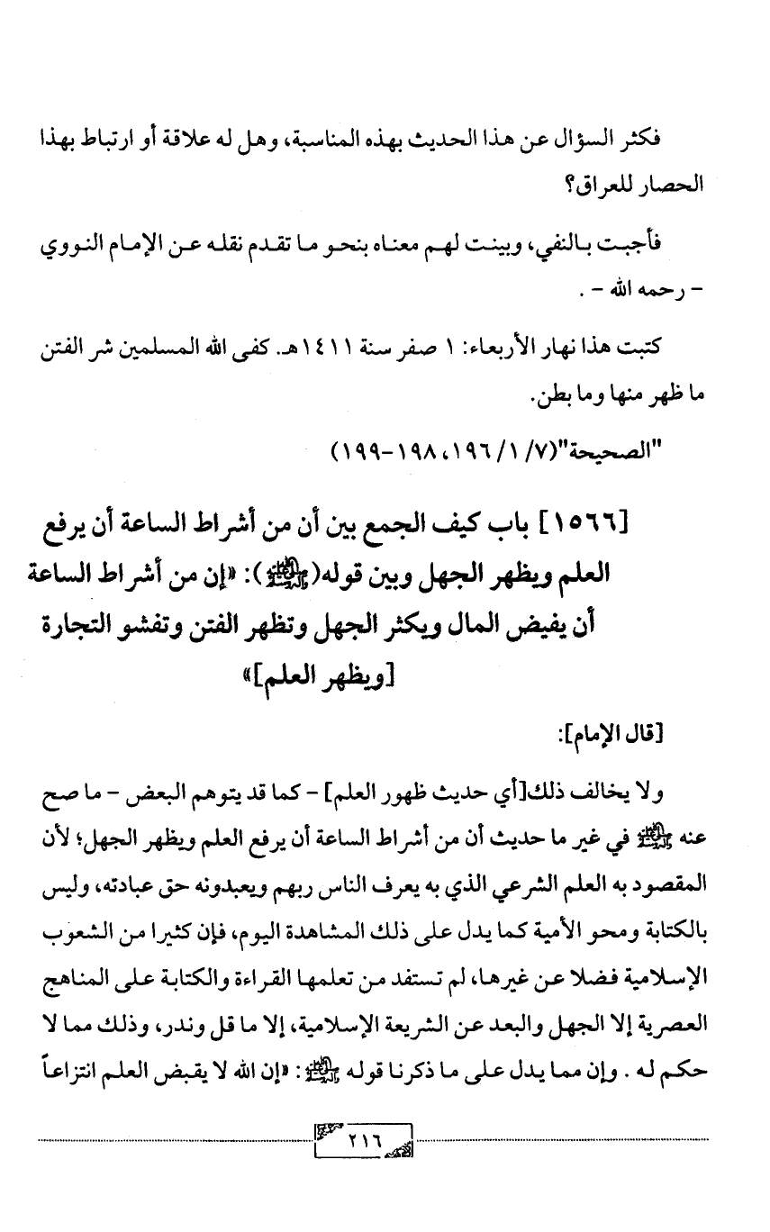 ولا يخالف ذلك [أي حديث ظهور العلم]- كما قد يتوهم البعض - ما صح عنه - صلى الله عليه وآله وسلم - في غير ما حديث أن من أشراط الساعة أن يرفع العلم ويظهر الجهل؛ لأن المقصود به العلم الشرعي الذي به يعرف الناس ربهم ويعبدونه حق عبادته، وليس بالكتابة ومحو الأمية كما يدل على ذلك المشاهدة اليوم، فإن كثيرا من الشعوب الإسلامية فضلا عن غيرها، لم تستفد من تعلمها القراءة والكتابة على المناهج العصرية إلا الجهل والبعد عن الشريعة الإسلامية، إلا ما قل وندر، وذلك مما لا حكم له. وإن مما يدل على ما ذكرنا قوله - صلى الله عليه وآله وسلم -: «إن الله لا يقبض العلم انتزاعاً
