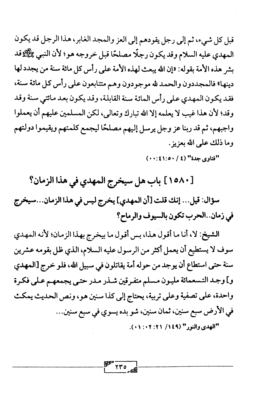 الشيخ: لا، أنا ما أقول هذا، بس أقول ما بيخرج بهذا الزمان؛ لأنه المهدي سوف لا يستطيع أن يعمل أكثر من الرسول عليه السلام، الذي ظل بقومه عشرين سنة حتى استطاع أن يوجد من حوله أمة يقاتلون في سبيل الله، فلو خرج [المهدي و] وجد التسعمائة مليون مسلم متفرقين شذر مدر حتى يجمعهم على فكرة واحدة، على تصفية وعلى تربية، يحتاج إلى كذا سنين هو، ونص الحديث يمكث في الأرض سبع سنين، ثمان سنين، شو بده يسوي في سبع سنين ...