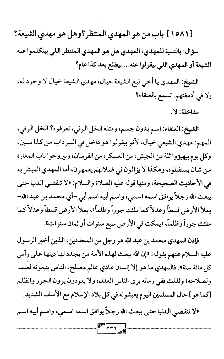 الشيخ: العنقاء: اسم بدون جسم، ومثله الخل الوفي، تعرفوه؟ الخل الوفي، المهم: مهدي الشيعي خيال، لأنو بيقولوا هو داخل في السرداب من كذا سنين، وكل يوم بيهيؤوا ثلة من الجيش، من العسكر، من الفرسان، وبيروحوا باب المغارة من شان يستقبلوه، وهكذا لا يزالون في ضلالهم يعمهون، أما المهدي المبشر به في الأحاديث الصحيحة، ومنها قوله عليه الصلاة والسلام: «لا تنقضي الدنيا حتى يبعث الله رجلاً يوافق اسمه اسمي، واسم أبيه اسم أبي -أي محمد بن عبد الله- يملأ الأرض قسطاً وعدلاً كما ملئت جوراً وظلماً»، يملأ الأرض قسطاً وعدلاً كما ملئت جوراً وظلماً، «يمكث في الأرض سبع سنوات أو ثمان سنوات».