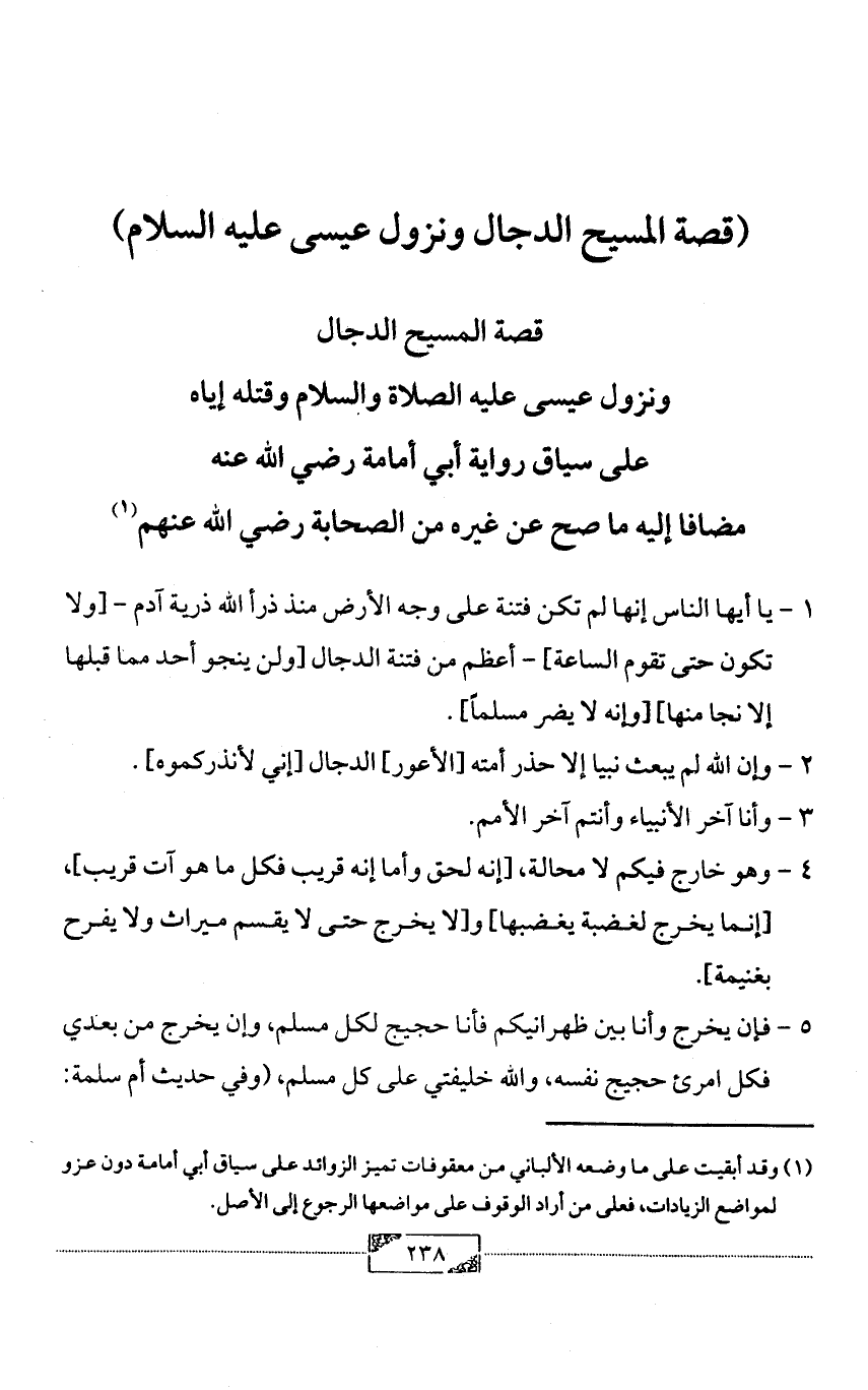 (¬1) وقد أبقيت على ما وضعه الألباني من معقوفات تميز الزوائد على سياق أبي أمامة دون عزو لمواضع الزيادات، فعلى من أراد الوقوف على مواضعها الرجوع إلى الأصل.