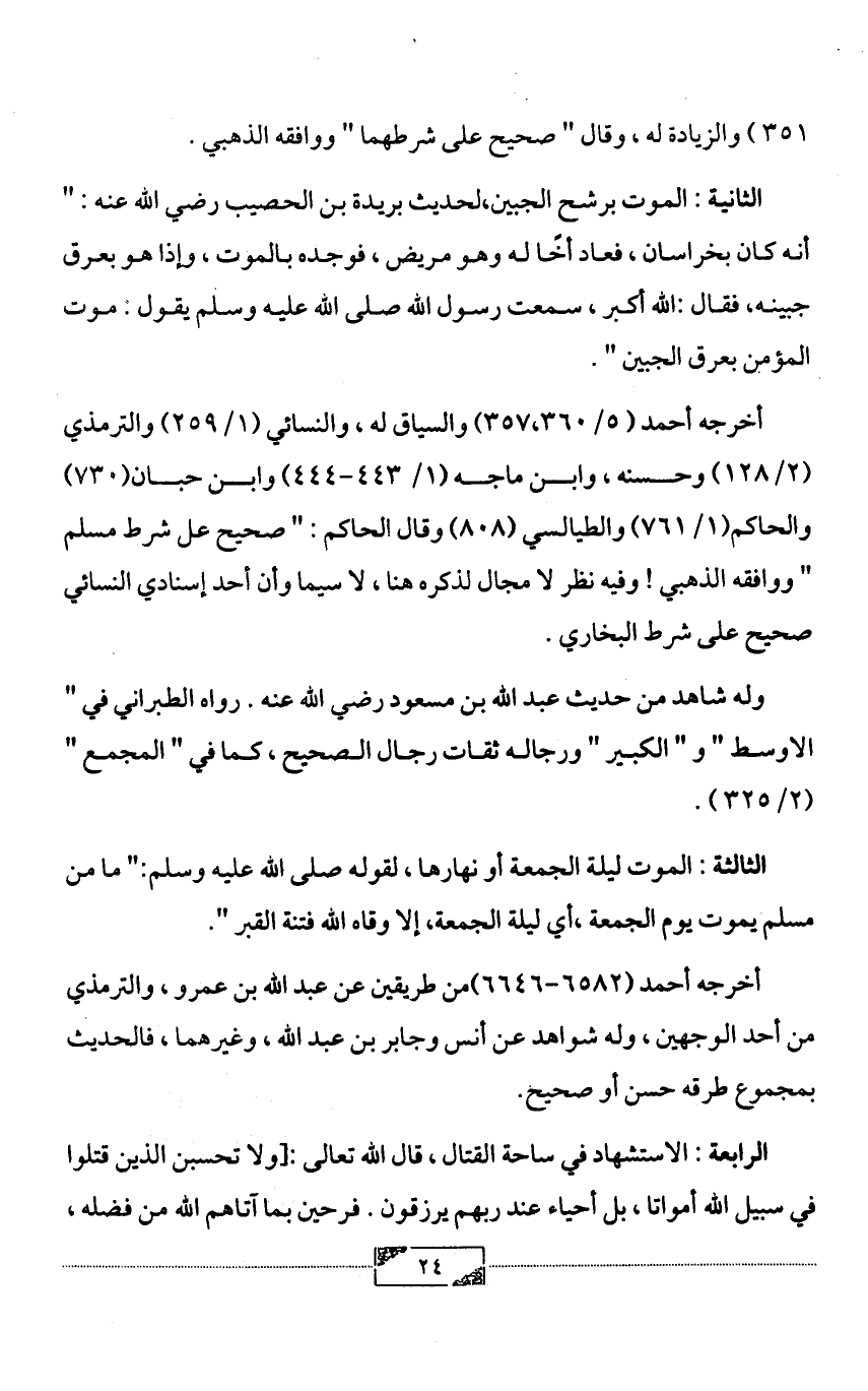 الثالثة: الموت ليلة الجمعة أو نهارها، لقوله صلى الله عليه وسلم:" ما من مسلم يموت يوم الجمعة، أي ليلة الجمعة، إلا وقاه الله فتنة القبر ".