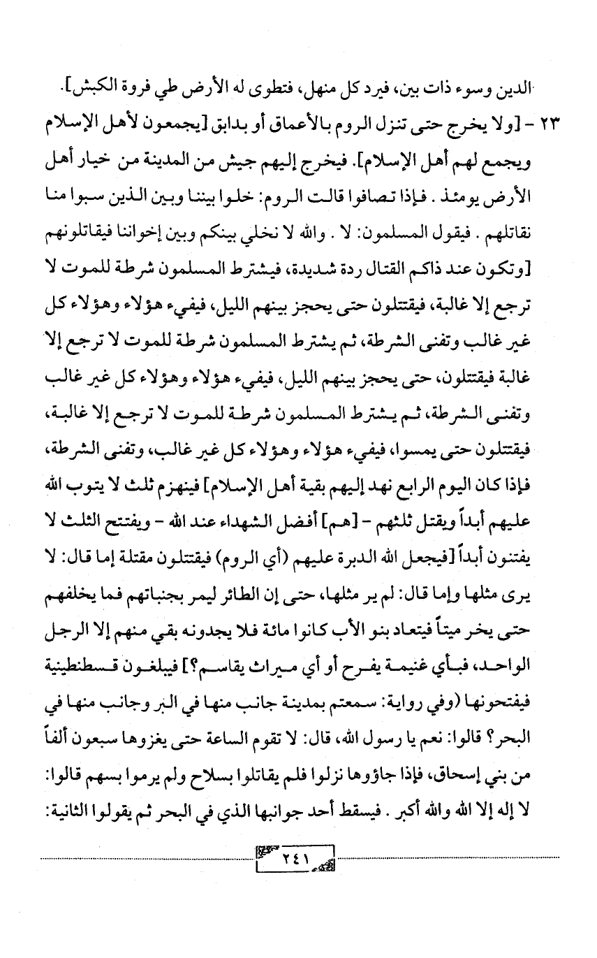 23 - [ولا يخرج حتى تنزل الروم بالأعماق أو بدابق [يجمعون لأهل الإسلام ويجمع لهم أهل الإسلام]. فيخرج إليهم جيش من المدينة من خيار أهل الأرض يومئذ. فإذا تصافوا قالت الروم: خلوا بيننا وبين الذين سبوا منا نقاتلهم. فيقول المسلمون: لا. والله لا نخلي بينكم وبين إخواننا فيقاتلونهم [وتكون عند ذاكم القتال ردة شديدة، فيشترط المسلمون شرطة للموت لا ترجع إلا غالبة، فيقتتلون حتى يحجز بينهم الليل، فيفيء هؤلاء وهؤلاء كل غير غالب وتفنى الشرطة، ثم يشترط المسلمون شرطة للموت لا ترجع إلا غالبة فيقتتلون، حتى يحجز بينهم الليل، فيفيء هؤلاء وهؤلاء كل غير غالب وتفنى الشرطة، ثم يشترط المسلمون شرطة للموت لا ترجع إلا غالبة، فيقتتلون حتى يمسوا، فيفيء هؤلاء وهؤلاء كل غير غالب، وتفنى الشرطة، فإذا كان اليوم الرابع نهد إليهم بقية أهل الإسلام] فينهزم ثلث لا يتوب الله عليهم أبداً ويقتل ثلثهم -[هم] أفضل الشهداء عند الله - ويفتتح الثلث لا يفتنون أبداً [فيجعل الله الدبرة عليهم (أي الروم) فيقتتلون مقتلة إما قال: لا يرى مثلها وإما قال: لم ير مثلها، حتى إن الطائر ليمر بجنباتهم فما يخلفهم حتى يخر ميتاً فيتعاد بنو الأب كانوا مائة فلا يجدونه بقي منهم إلا الرجل الواحد، فبأي غنيمة يفرح أو أي ميراث يقاسم؟] فيبلغون قسطنطينية فيفتحونها (وفي رواية: سمعتم بمدينة جانب منها في البر وجانب منها في البحر؟ قالوا: نعم يا رسول الله، قال: لا تقوم الساعة حتى يغزوها سبعون ألفاً من بني إسحاق، فإذا جاؤوها نزلوا فلم يقاتلوا بسلاح ولم يرموا بسهم قالوا: لا إله إلا الله والله أكبر. فيسقط أحد جوانبها الذي في البحر ثم يقولوا الثانية: