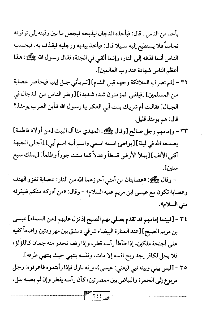 35 - [ليس بيني وبينه نبي (يعني: عيسى)، وإنه نازل فإذا رأيتموه فاعرفوه: رجل مربوع إلى الحمرة والبياض بين ممصرتين، كأن رأسه يقطر وإن لم يصبه بلل،