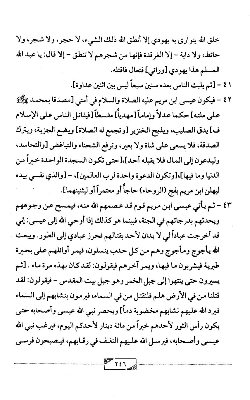43 - ثم يأتي عيسى ابن مريم قوم قد عصمهم الله منه، فيمسح عن وجوههم ويحدثهم بدرجاتهم في الجنة، فبينما هو كذلك إذا أوحي الله إلى عيسى: إني قد أخرجت عباداً لي لا يدان لأحد بقتالهم فحرز عبادي إلى الطور. ويبعث الله يأجوج ومأجوج وهم من كل حدب ينسلون، فيمر أوائلهم على بحيرة طبرية فيشربون ما فيها، ويمر آخرهم فيقولون: لقد كان بهذه مرة ماء. [ثم يسيرون حتى ينتهوا إلى جبل الخمر وهو جبل بيت المقدس - فيقولون: لقد قتلنا من في الأرض هلم فلنقتل من في السماء، فيرمون بنشابهم إلى السماء فيرد الله عليهم نشابهم مخضوبة دماً] ويحصر نبي الله عيسى وأصحابه حتى يكون رأس الثور لأحدهم خيراً من مائة دينار لأحدكم اليوم، فيرغب نبي الله عيسى وأصحابه، فيرسل الله عليهم النغف في رقابهم، فيصبحون فرسى