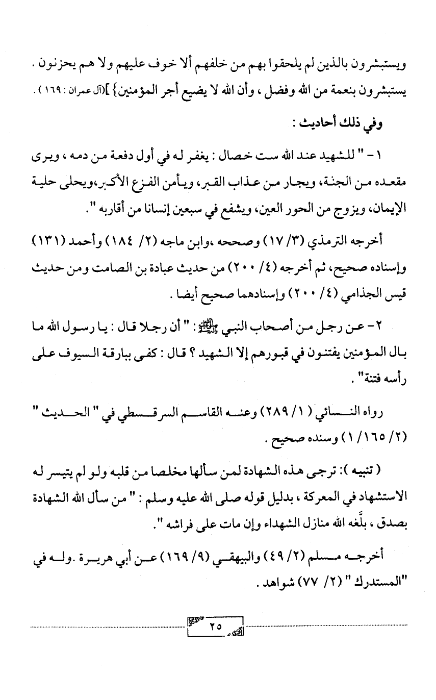 (تنبيه): ترجى هذه الشهادة لمن سألها مخلصا من قلبه ولو لم يتيسر له الاستشهاد في المعركة، بدليل قوله صلى الله عليه وسلم: " من سأل الله الشهادة بصدق، بلَّغه الله منازل الشهداء وإن مات على فراشه ".
