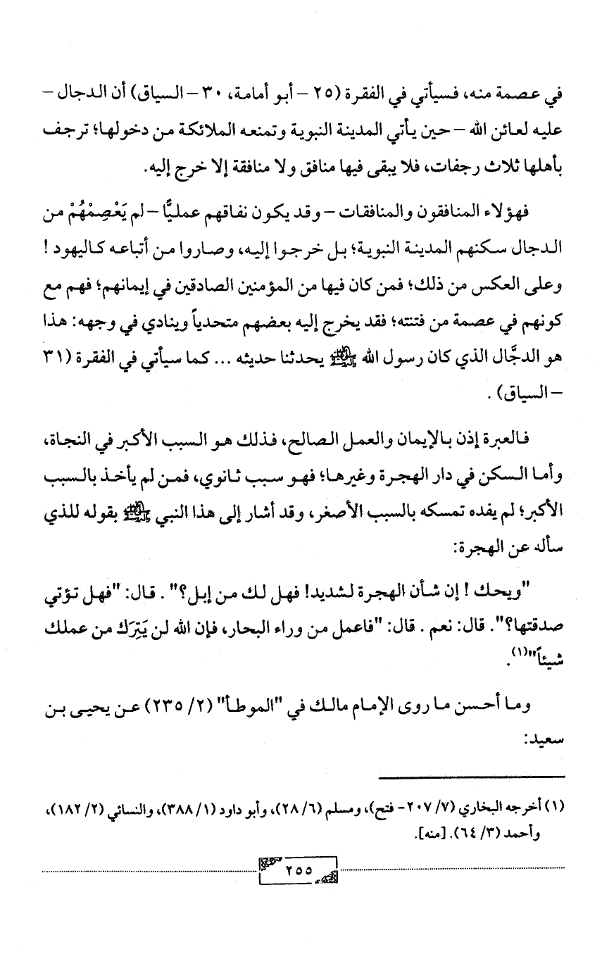فالعبرة إذن بالإيمان والعمل الصالح، فذلك هو السبب الأكبر في النجاة، وأما السكن في دار الهجرة وغيرها؛ فهو سبب ثانوي، فمن لم يأخذ بالسبب الأكبر؛ لم يفده تمسكه بالسبب الأصغر، وقد أشار إلى هذا النبي - صلى الله عليه وآله وسلم - بقوله للذي سأله عن الهجرة: