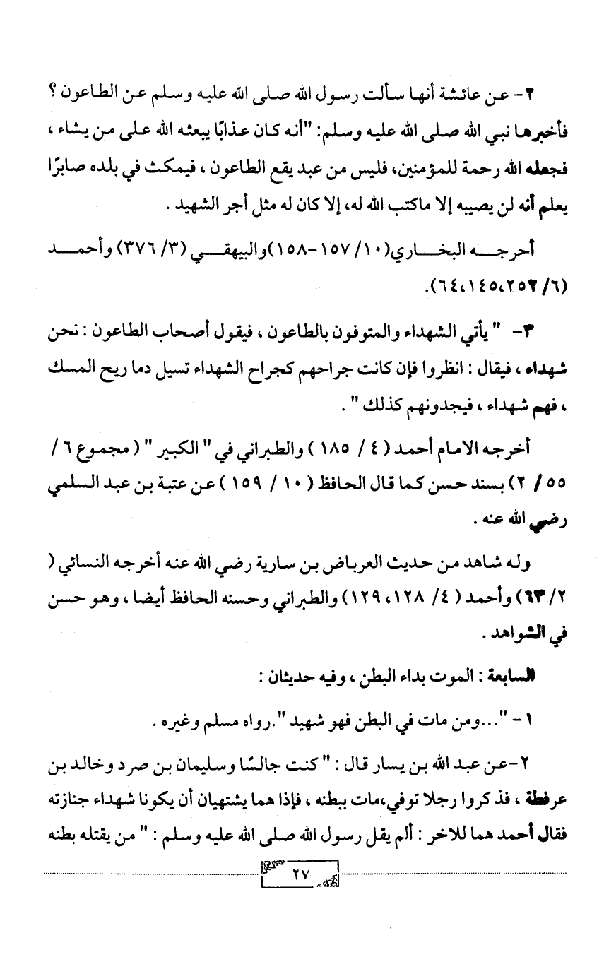 3 - " يأتي الشهداء والمتوفون بالطاعون، فيقول أصحاب الطاعون: نحن شهداء، فيقال: انظروا فإن كانت جراحهم كجراح الشهداء تسيل دما ريح المسك، فهم شهداء، فيجدونهم كذلك ".