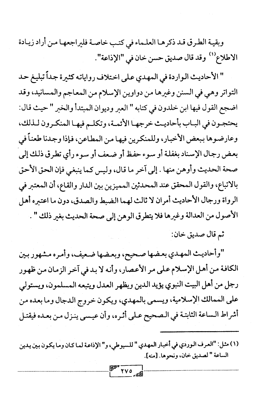 (¬1) مثل: "العرف الوردي في أخبار المهدي " للسيوطي، و" الإذاعة لما كان وما يكون بين يدين الساعة " لصديق خان، ونحوها. [منه].