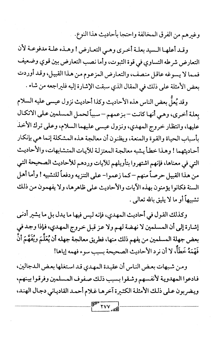 وكذلك القول في أحاديث المهدي، فإنه ليس فيها ما يدل بل ما يشير أدنى إشارة إلى أن المسلمين لا نهضة لهم ولا عز قبل خروج المهدي، فإذا وجد في بعض جهلة المسلمين من يفهم ذلك منها، فطريق معالجة جهله أن يُعَلَّمَ ويُفَهَّمَ أنَّ فَهْمَهُ خَطَأٌ، لا أن نرد الأحاديث الصحيحة بسبب سوء فهمه إياها!