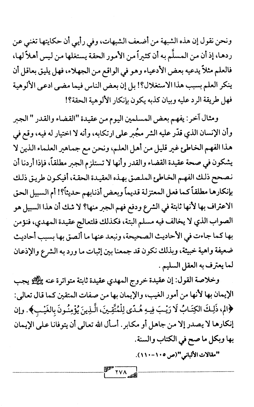 ومثال آخر: يفهم بعض المسلمين اليوم من عقيدة "القضاء والقدر " الجبر وأن الإنسان الذي قدّر عليه الشر مُجبر على ارتكابه، وأنه لا اختيار له فيه، وقع في هذا الفهم الخاطئ غير قليل من أهل العلم، ونحن مع جماهير العلماء الذين لا يشكون في صحة عقيدة القضاء والقدر وأنها لا تستلزم الجبر مطلقاً، فإذا أردنا أن نصحح ذلك الفهم الخاطئ الملصق بهذه العقيدة الحقة، أفيكون طريق ذلك بإنكارها مطلقاً كما فعل المعتزلة قديماً وبعض أذنابهم حديثاً؟! أم السبيل الحق الاعتراف بها لأنها ثابتة في الشرع ودفع فهم الجبر منها؟ لا شك أن هذا السبيل هو الصواب الذي لا يخالف فيه مسلم البتة، فكذلك فلتعالج عقيدة المهدي، فنؤمن بها كما جاءت في الأحاديث الصحيحة، ونبعد عنها ما ألصق بها بسبب أحاديث ضعيفة واهية خبيثة، وبذلك نكون قد جمعنا بين إثبات ما ورد به الشرع والإذعان لما يعترف به العقل السليم.