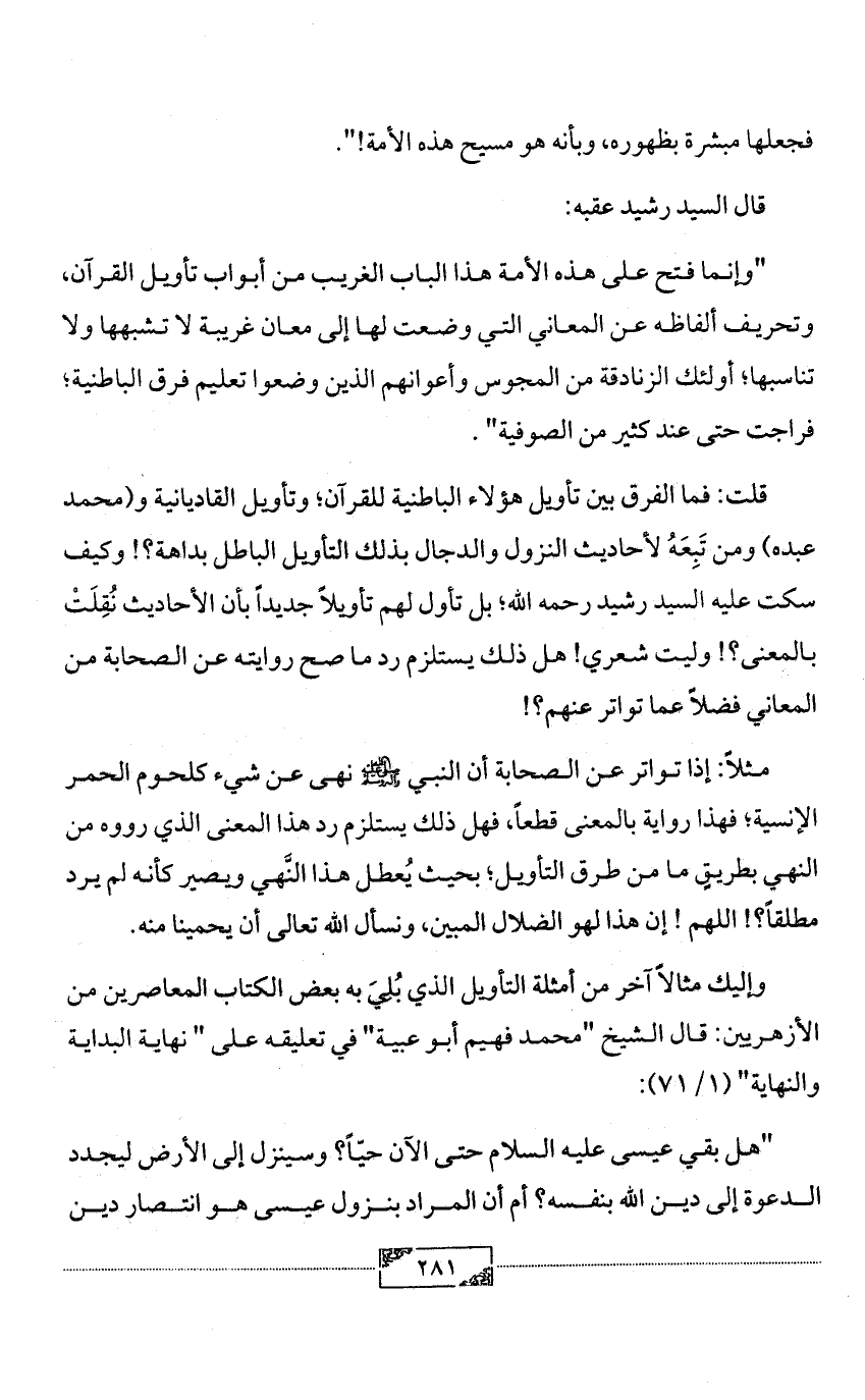 قلت: فما الفرق بين تأويل هؤلاء الباطنية للقرآن؛ وتأويل القاديانية و (محمد عبده) ومن تَبِعَهُ لأحاديث النزول والدجال بذلك التأويل الباطل بداهة؟! وكيف سكت عليه السيد رشيد رحمه الله؛ بل تأول لهم تأويلاً جديداً بأن الأحاديث نُقِلَتْ بالمعنى؟! وليت شعري! هل ذلك يستلزم رد ما صح روايته عن الصحابة من المعاني فضلاً عما تواتر عنهم؟!