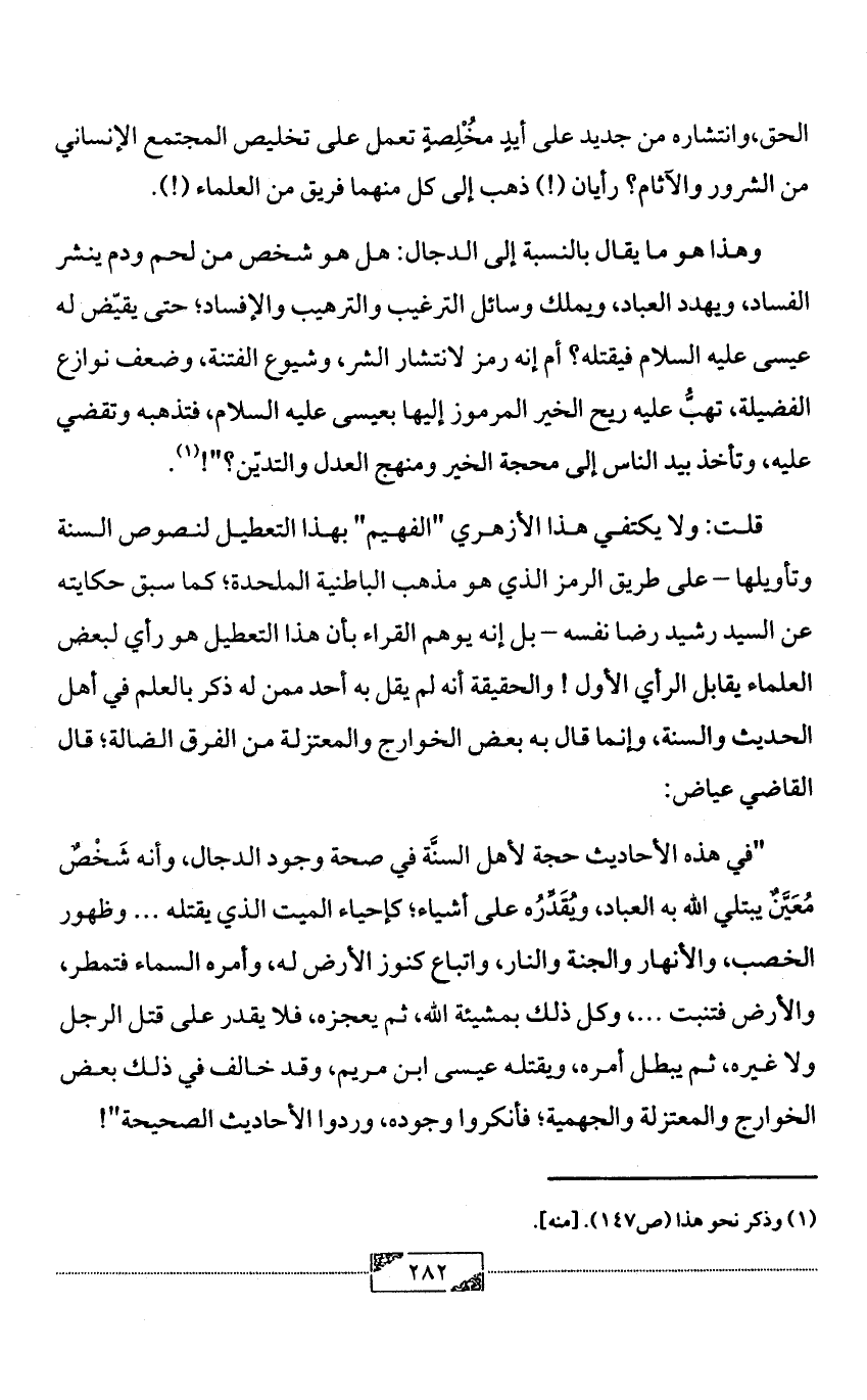 قلت: ولا يكتفي هذا الأزهري "الفهيم" بهذا التعطيل لنصوص السنة وتأويلها - على طريق الرمز الذي هو مذهب الباطنية الملحدة؛ كما سبق حكايته عن السيد رشيد رضا نفسه - بل إنه يوهم القراء بأن هذا التعطيل هو رأي لبعض العلماء يقابل الرأي الأول! والحقيقة أنه لم يقل به أحد ممن له ذكر بالعلم في أهل الحديث والسنة، وإنما قال به بعض الخوارج والمعتزلة من الفرق الضالة؛ قال القاضي عياض: