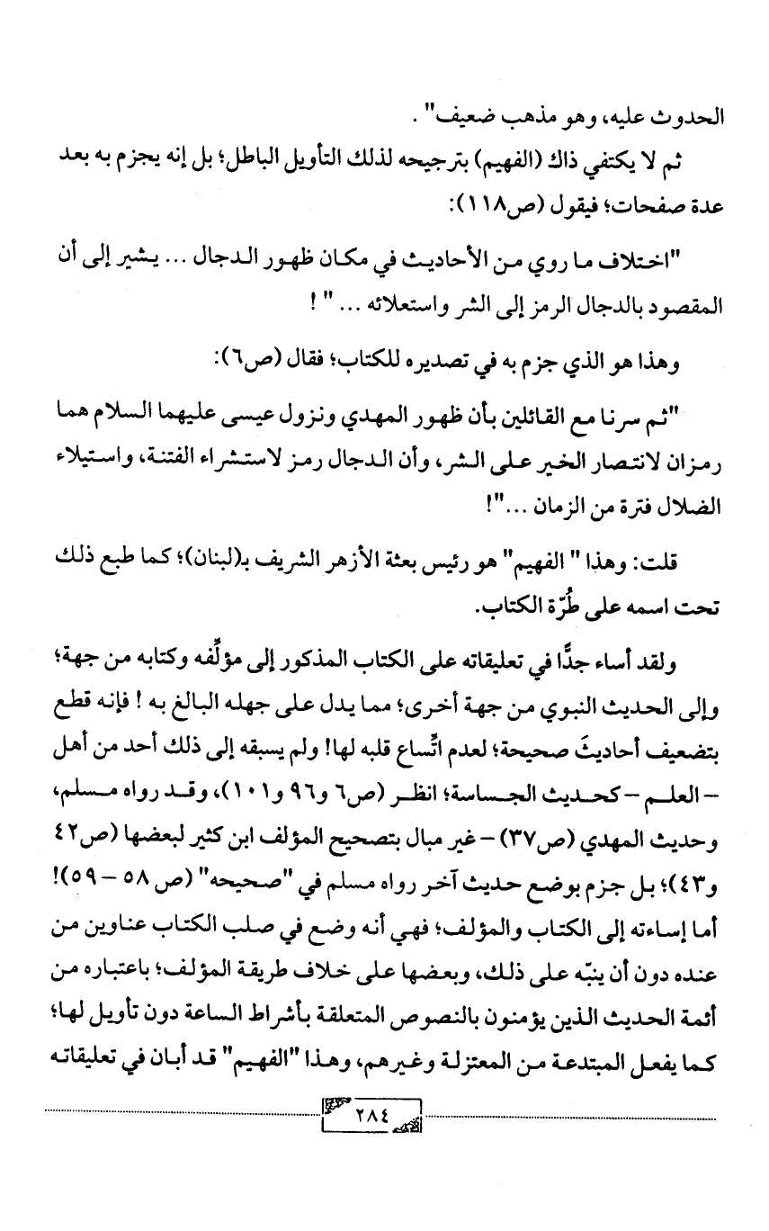 ولقد أساء جدًّا في تعليقاته على الكتاب المذكور إلى مؤلِّفه وكتابه من جهة؛ وإلى الحديث النبوي من جهة أخرى؛ مما يدل على جهله البالغ به! فإنه قطع بتضعيف أحاديثَ صحيحة؛ لعدم اتِّساع قلبه لها! ولم يسبقه إلى ذلك أحد من أهل - العلم - كحديث الجساسة؛ انظر (ص6 و96 و101)، وقد رواه مسلم، وحديث المهدي (ص37) - غير مبال بتصحيح المؤلف ابن كثير لبعضها (ص42 و43)؛ بل جزم بوضع حديث آخر رواه مسلم في "صحيحه" (ص 58 - 59)! أما إساءته إلى الكتاب والمؤلف؛ فهي أنه وضع في صلب الكتاب عناوين من عنده دون أن ينبّه على ذلك، وبعضها على خلاف طريقة المؤلف؛ باعتباره من أئمة الحديث الذين يؤمنون بالنصوص المتعلقة بأشراط الساعة دون تأويل لها؛ كما يفعل المبتدعة من المعتزلة وغيرهم، وهذا "الفهيم" قد أبان في تعليقاته