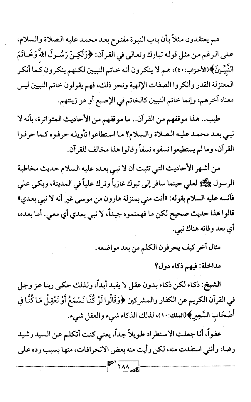 طيب .. هذا موقفهم من القرآن .. ما موقفهم من الأحاديث المتواترة، بأنه لا نبي بعد محمد عليه الصلاة والسلام؟ ما استطاعوا تأويله حرفوه كما حرفوا القرآن، وما لم يستطيعوا نسفوه نسفاً وقالوا هذا مخالف للقرآن.