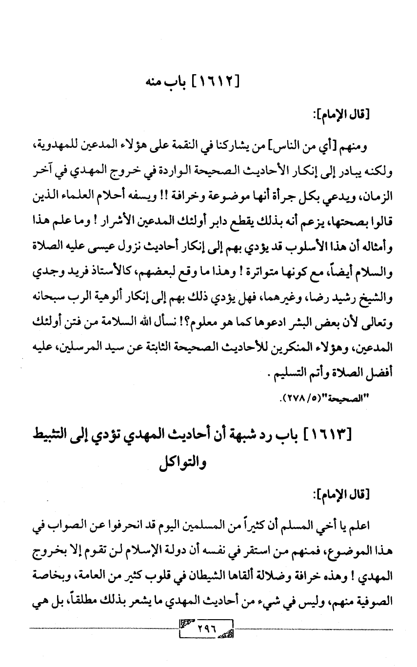ومنهم [أي من الناس] من يشاركنا في النقمة على هؤلاء المدعين للمهدوية، ولكنه يبادر إلى إنكار الأحاديث الصحيحة الواردة في خروج المهدي في آخر الزمان، ويدعي بكل جرأة أنها موضوعة وخرافة!! ويسفه أحلام العلماء الذين قالوا بصحتها، يزعم أنه بذلك يقطع دابر أولئك المدعين الأشرار! وما علم هذا وأمثاله أن هذا الأسلوب قد يؤدي بهم إلى إنكار أحاديث نزول عيسى عليه الصلاة والسلام أيضاً، مع كونها متواترة! وهذا ما وقع لبعضهم، كالأستاذ فريد وجدي والشيخ رشيد رضا، وغيرهما، فهل يؤدي ذلك بهم إلى إنكار ألوهية الرب سبحانه وتعالى لأن بعض البشر ادعوها كما هو معلوم؟! نسأل الله السلامة من فتن أولئك المدعين، وهؤلاء المنكرين للأحاديث الصحيحة الثابتة عن سيد المرسلين، عليه أفضل الصلاة وأتم التسليم.