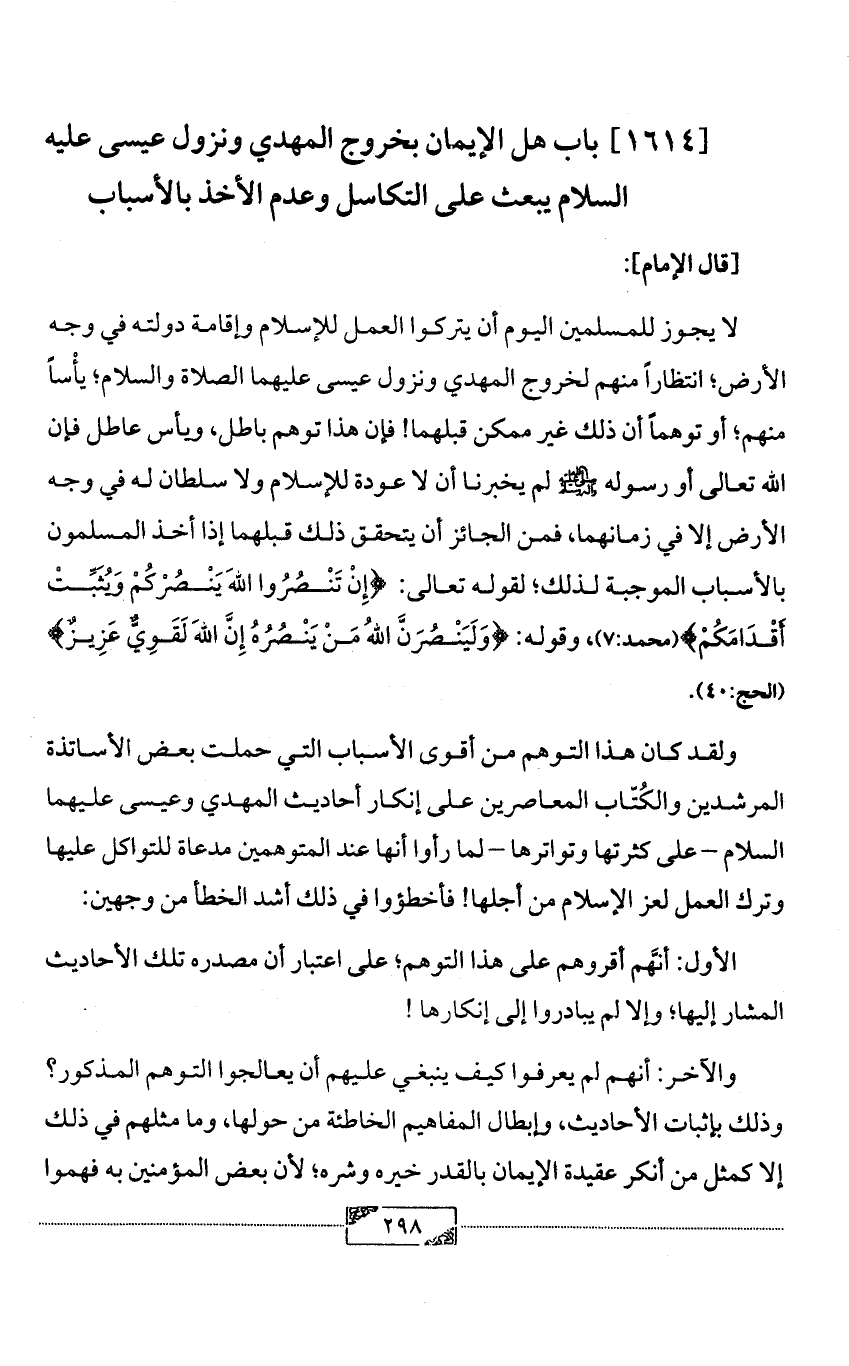 [1614] باب هل الإيمان بخروج المهدي ونزول عيسى عليه السلام يبعث على التكاسل وعدم الأخذ بالأسباب