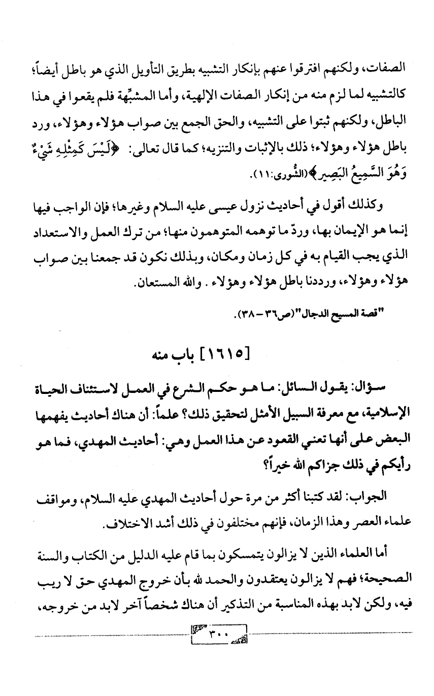 وكذلك أقول في أحاديث نزول عيسى عليه السلام وغيرها؛ فإن الواجب فيها إنما هو الإيمان بها، وردّ ما توهمه المتوهمون منها؛ من ترك العمل والاستعداد الذي يجب القيام به في كل زمان ومكان، وبذلك نكون قد جمعنا بين صواب هؤلاء وهؤلاء، ورددنا باطل هؤلاء وهؤلاء. والله المستعان.