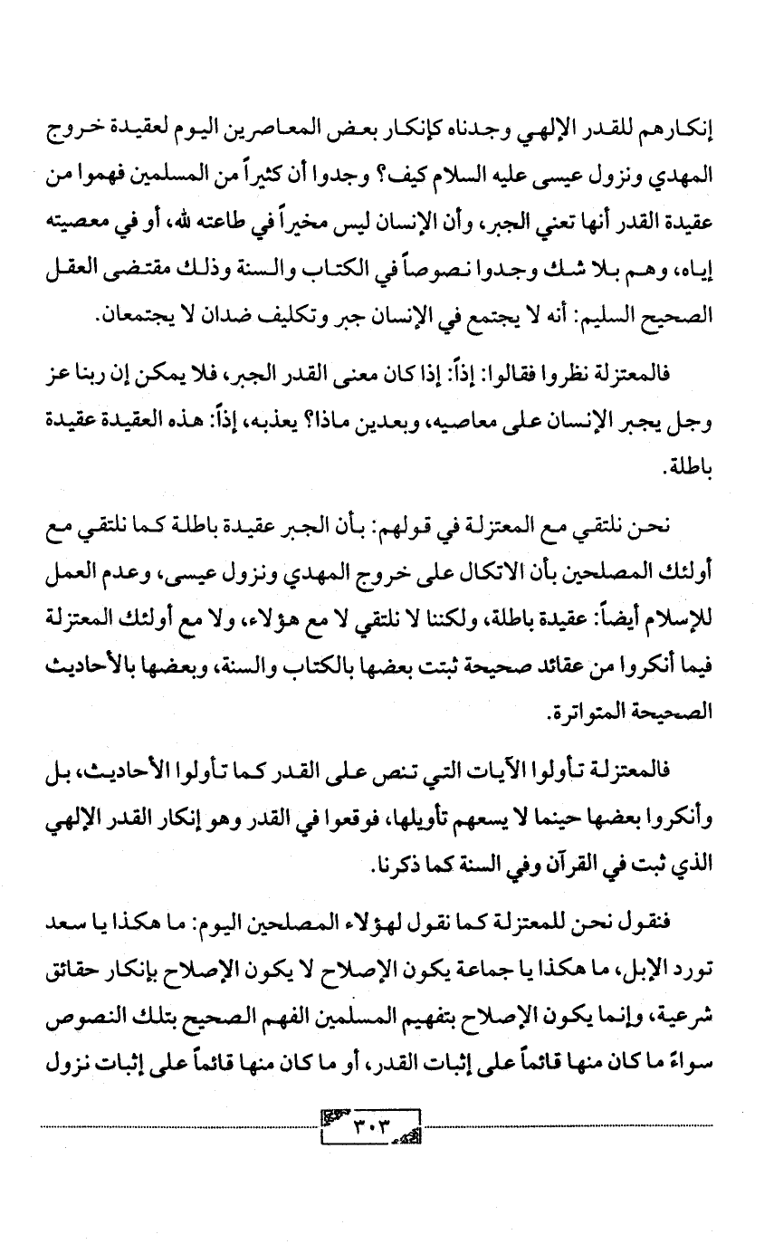 نحن نلتقي مع المعتزلة في قولهم: بأن الجبر عقيدة باطلة كما نلتقي مع أولئك المصلحين بأن الاتكال على خروج المهدي ونزول عيسى، وعدم العمل للإسلام أيضاً: عقيدة باطلة، ولكننا لا نلتقي لا مع هؤلاء، ولا مع أولئك المعتزلة فيما أنكروا من عقائد صحيحة ثبتت بعضها بالكتاب والسنة، وبعضها بالأحاديث الصحيحة المتواترة.