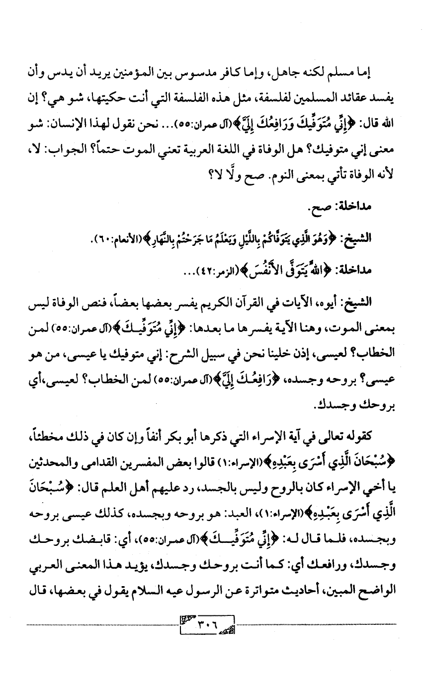 إما مسلم لكنه جاهل، وإما كافر مدسوس بين المؤمنين يريد أن يدس وأن يفسد عقائد المسلمين لفلسفة، مثل هذه الفلسفة التي أنت حكيتها، شو هي؟ إن الله قال: {إِنِّي مُتَوَفِّيكَ وَرَافِعُكَ إِلَيَّ} (آل عمران:55) ... نحن نقول لهذا الإنسان: شو معنى إني متوفيك؟ هل الوفاة في اللغة العربية تعني الموت حتماً؟ الجواب: لا، لأنه الوفاة تأتي بمعنى النوم. صح ولَّا لا؟