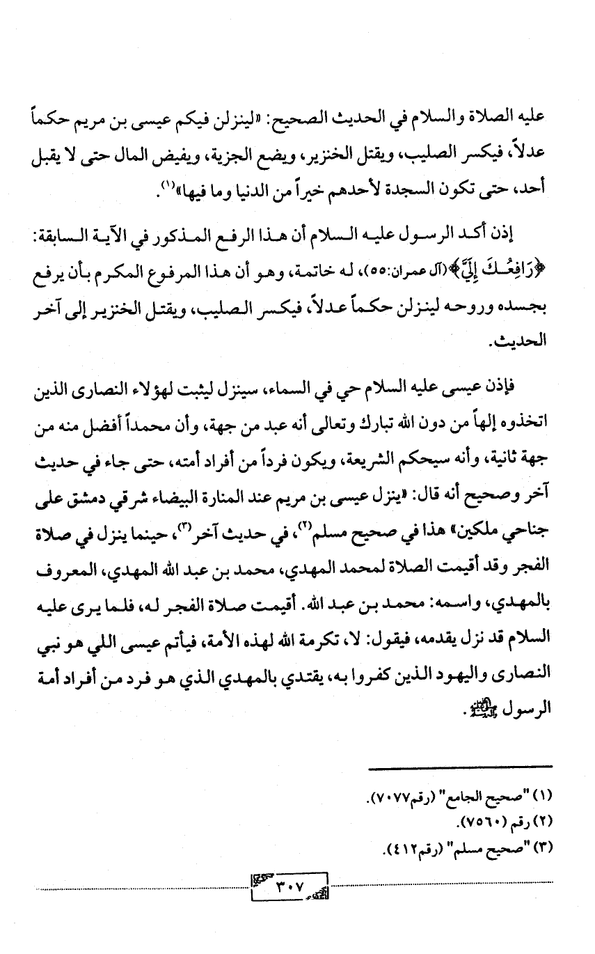 فإذن عيسى عليه السلام حي في السماء، سينزل ليثبت لهؤلاء النصارى الذين اتخذوه إلهاً من دون الله تبارك وتعالى أنه عبد من جهة، وأن محمداً أفضل منه من جهة ثانية، وأنه سيحكم الشريعة، ويكون فرداً من أفراد أمته، حتى جاء في حديث آخر وصحيح أنه قال: «ينزل عيسى بن مريم عند المنارة البيضاء شرقي دمشق على جناحي ملكين» هذا في صحيح مسلم (¬2)، في حديث آخر (¬3)، حينما ينزل في صلاة الفجر وقد أقيمت الصلاة لمحمد المهدي، محمد بن عبد الله المهدي، المعروف بالمهدي، واسمه: محمد بن عبد الله. أقيمت صلاة الفجر له، فلما يرى عليه السلام قد نزل يقدمه، فيقول: لا، تكرمة الله لهذه الأمة، فيأتم عيسى اللي هو نبي النصارى واليهود الذين كفروا به، يقتدي بالمهدي الذي هو فرد من أفراد أمة الرسول - صلى الله عليه وآله وسلم -.