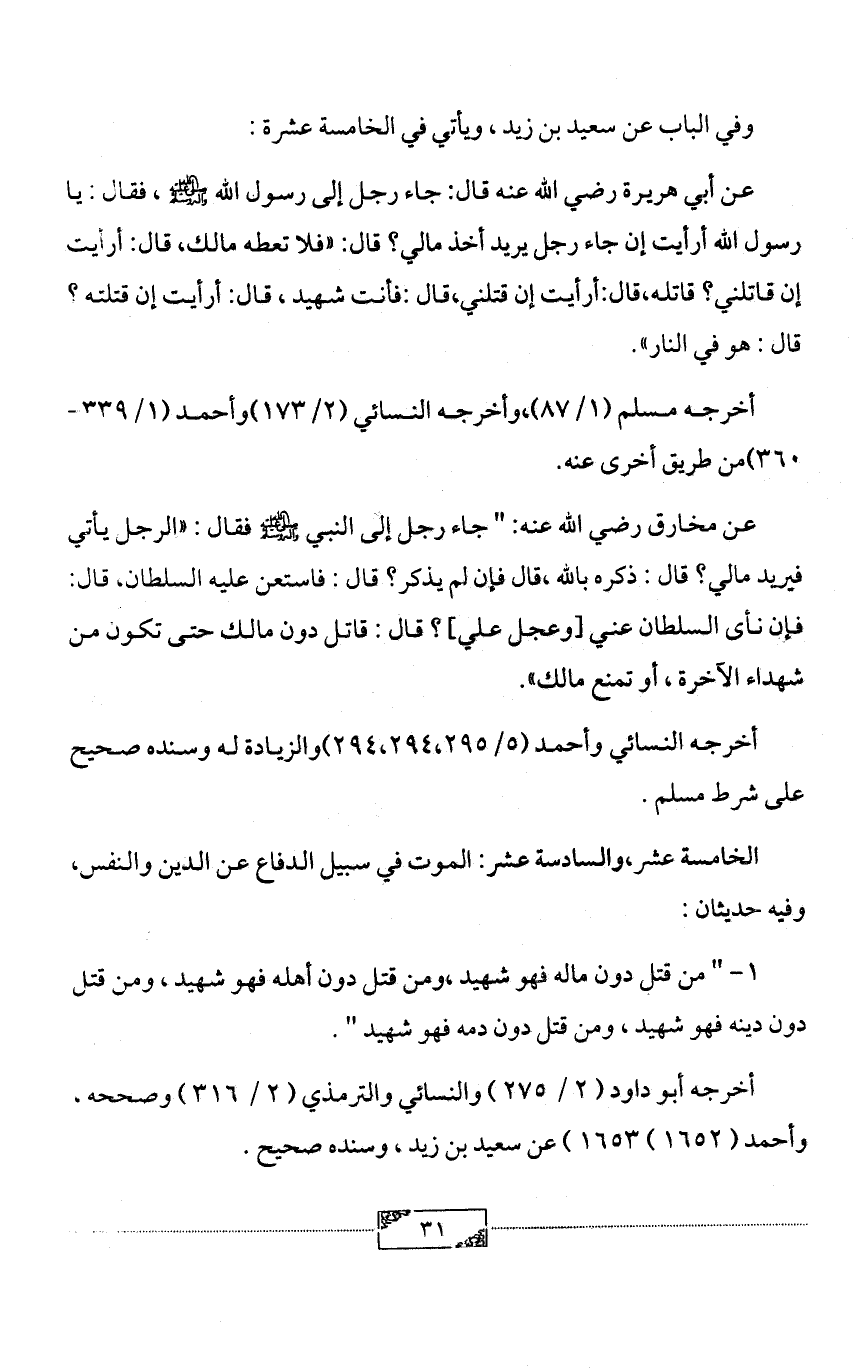 1 - " من قتل دون ماله فهو شهيد، ومن قتل دون أهله فهو شهيد، ومن قتل دون دينه فهو شهيد، ومن قتل دون دمه فهو شهيد ".